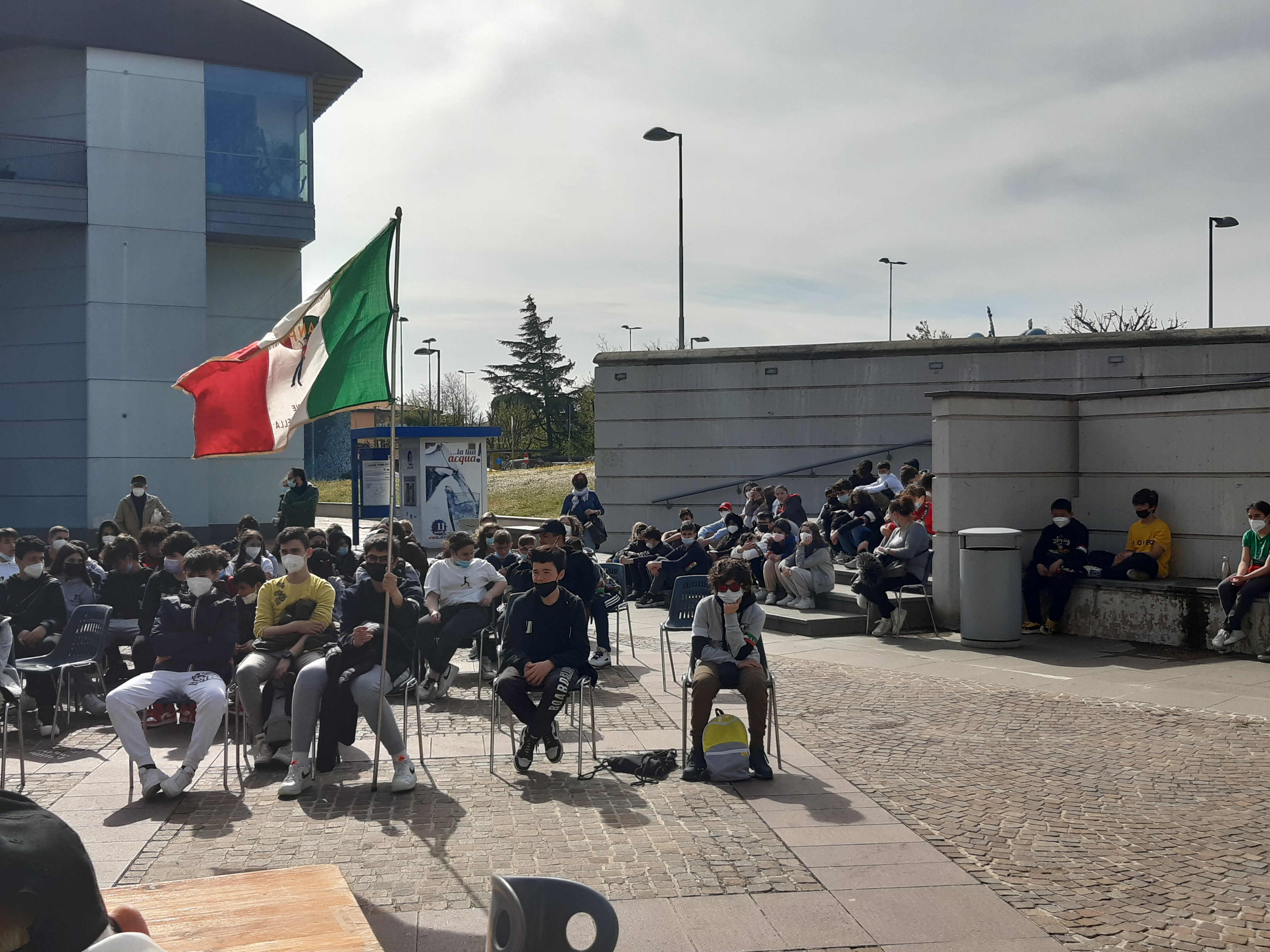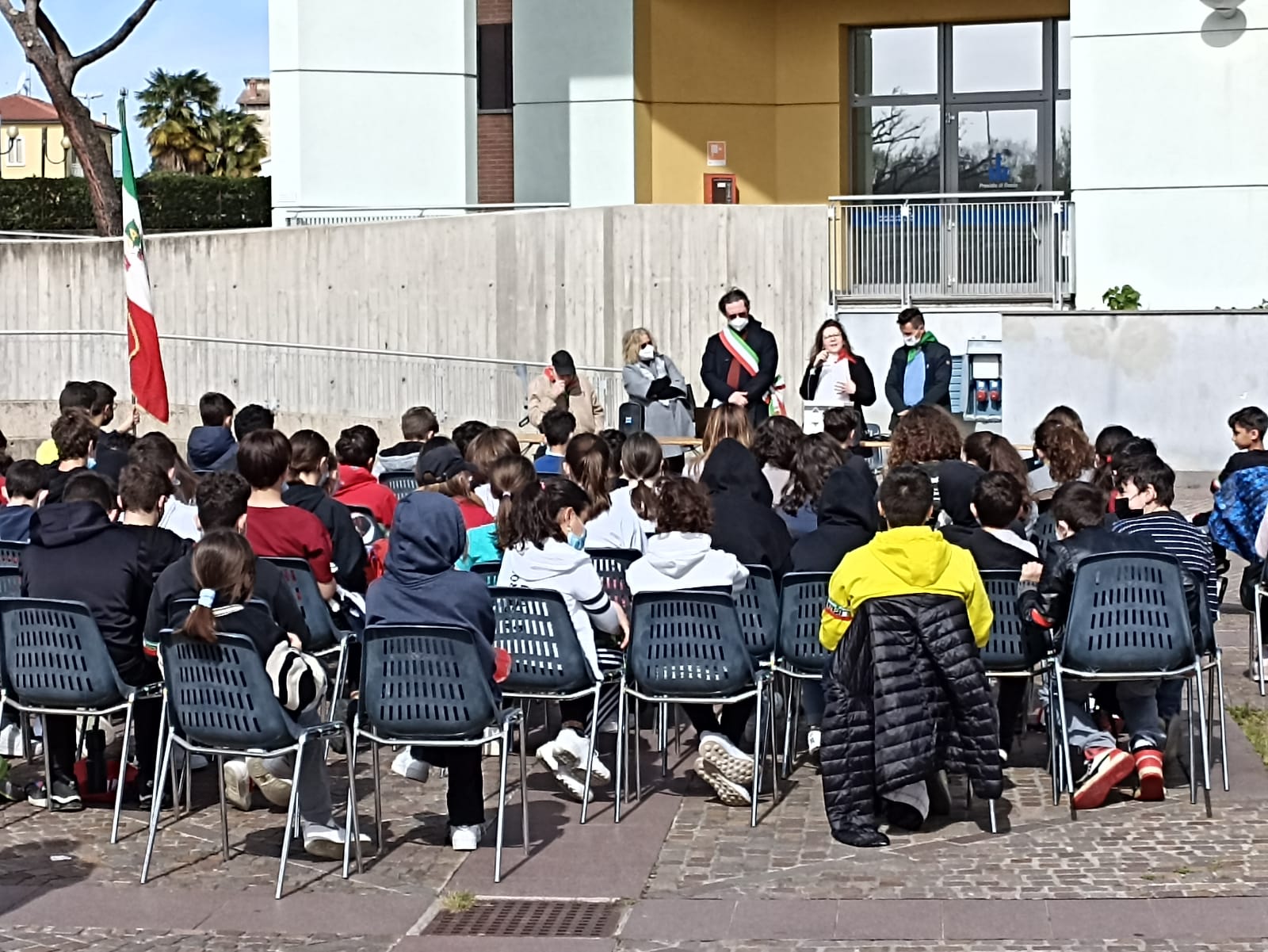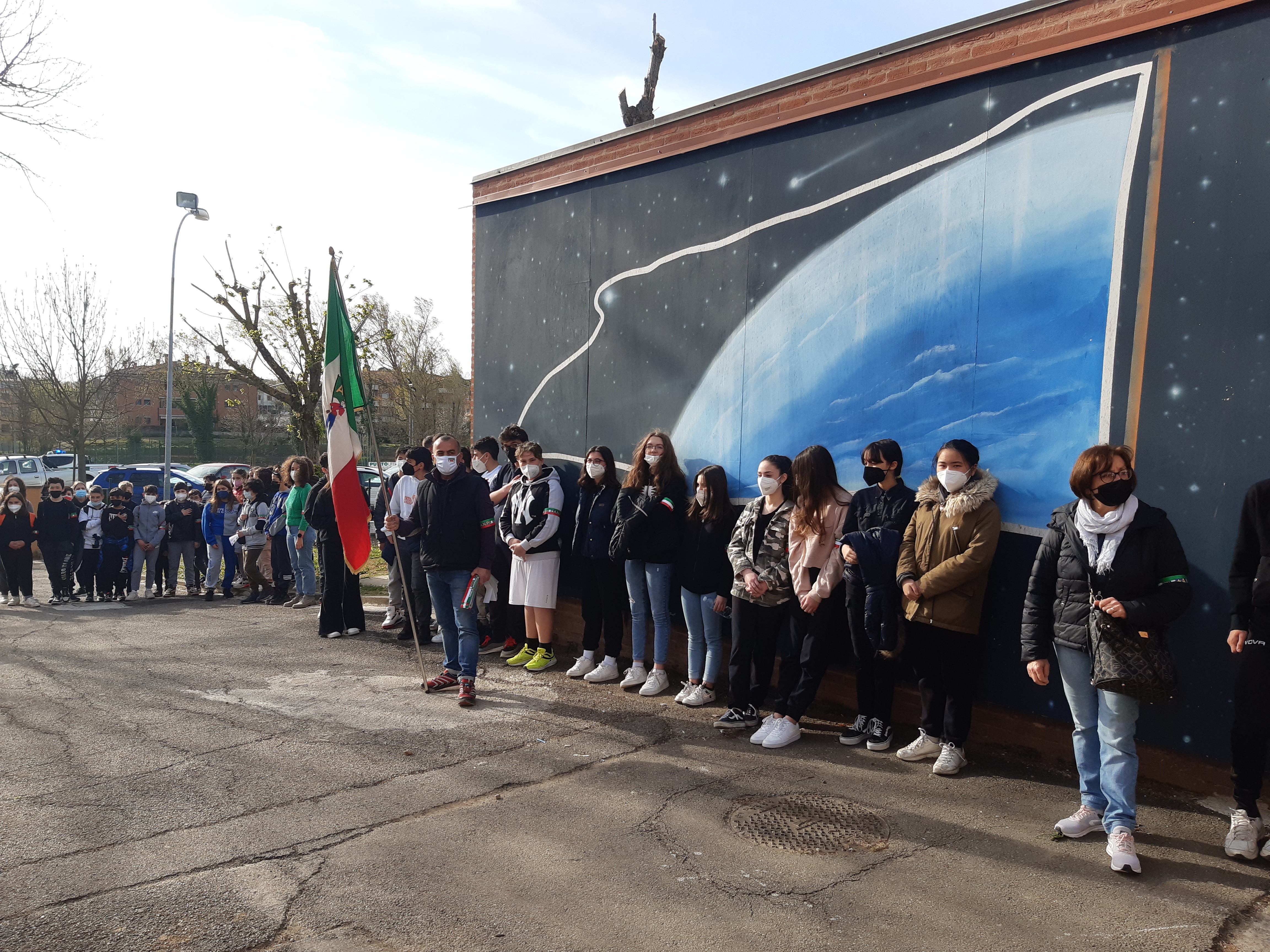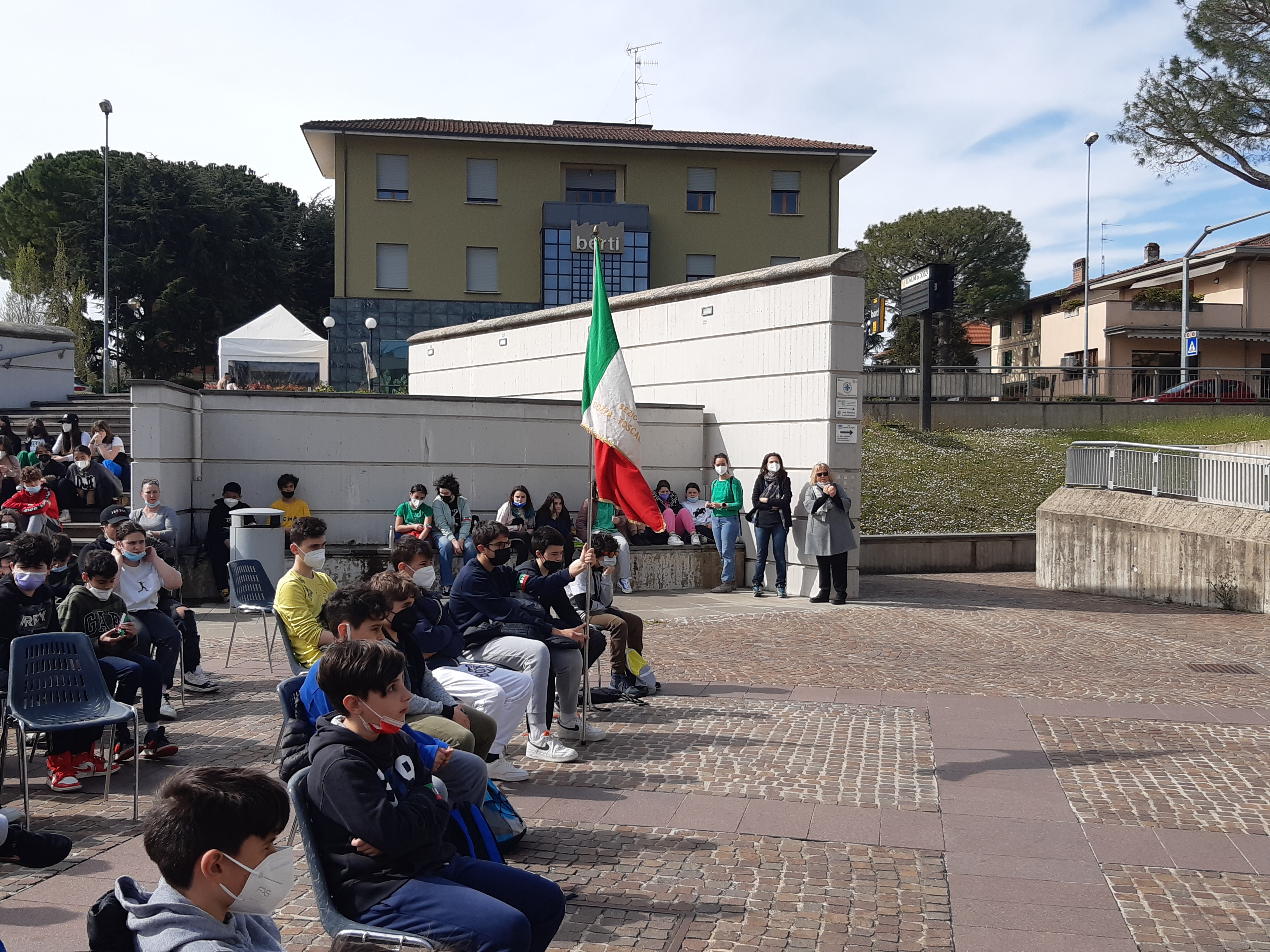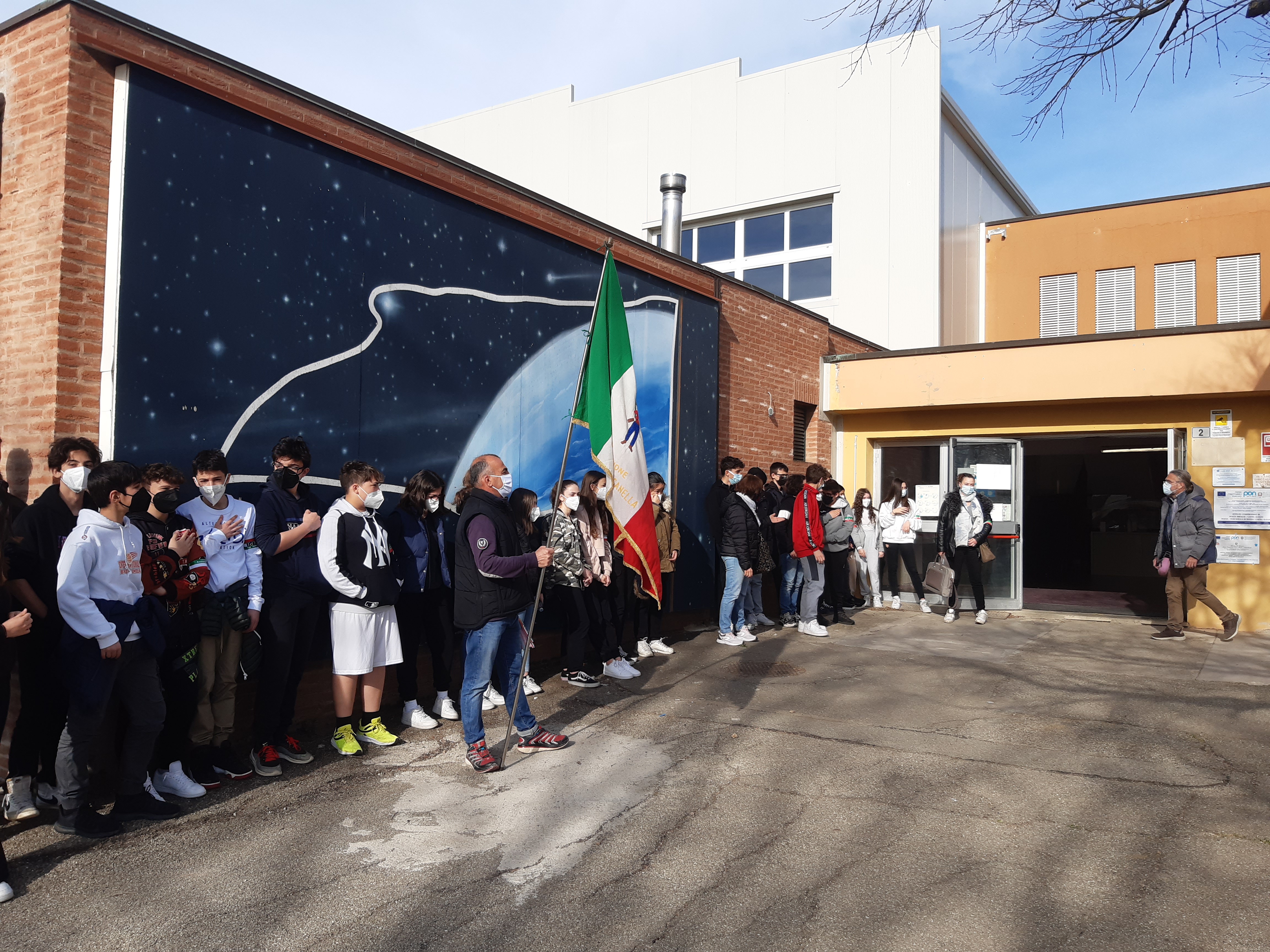 inaugurazione della lapide in ricordo di Andrea Gualandi, classi II A,B e C della Scuola Secondaria di I grado “Aldo Moro”- Progetto di arte pubblica per il 70° della Liberazione ideato da Annalisa Cattani, promosso dai dieci Comuni del Distretto culturale imolesi in collaborazione con Anpi, Cidra e Musei civici di Imola.