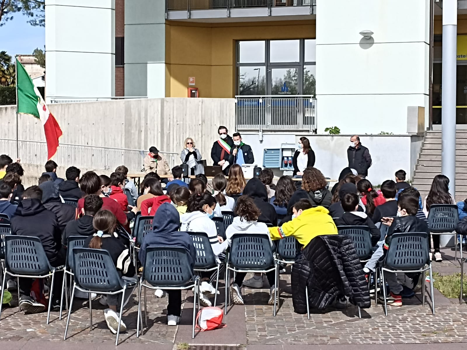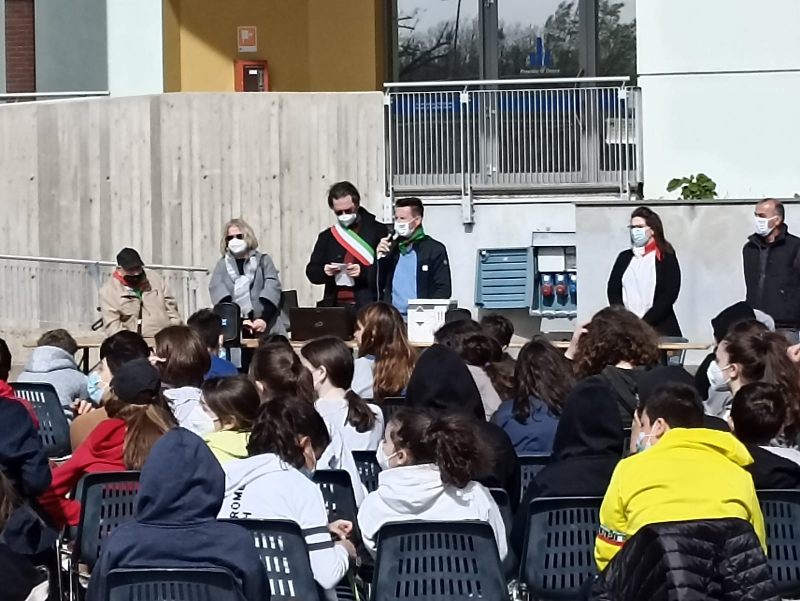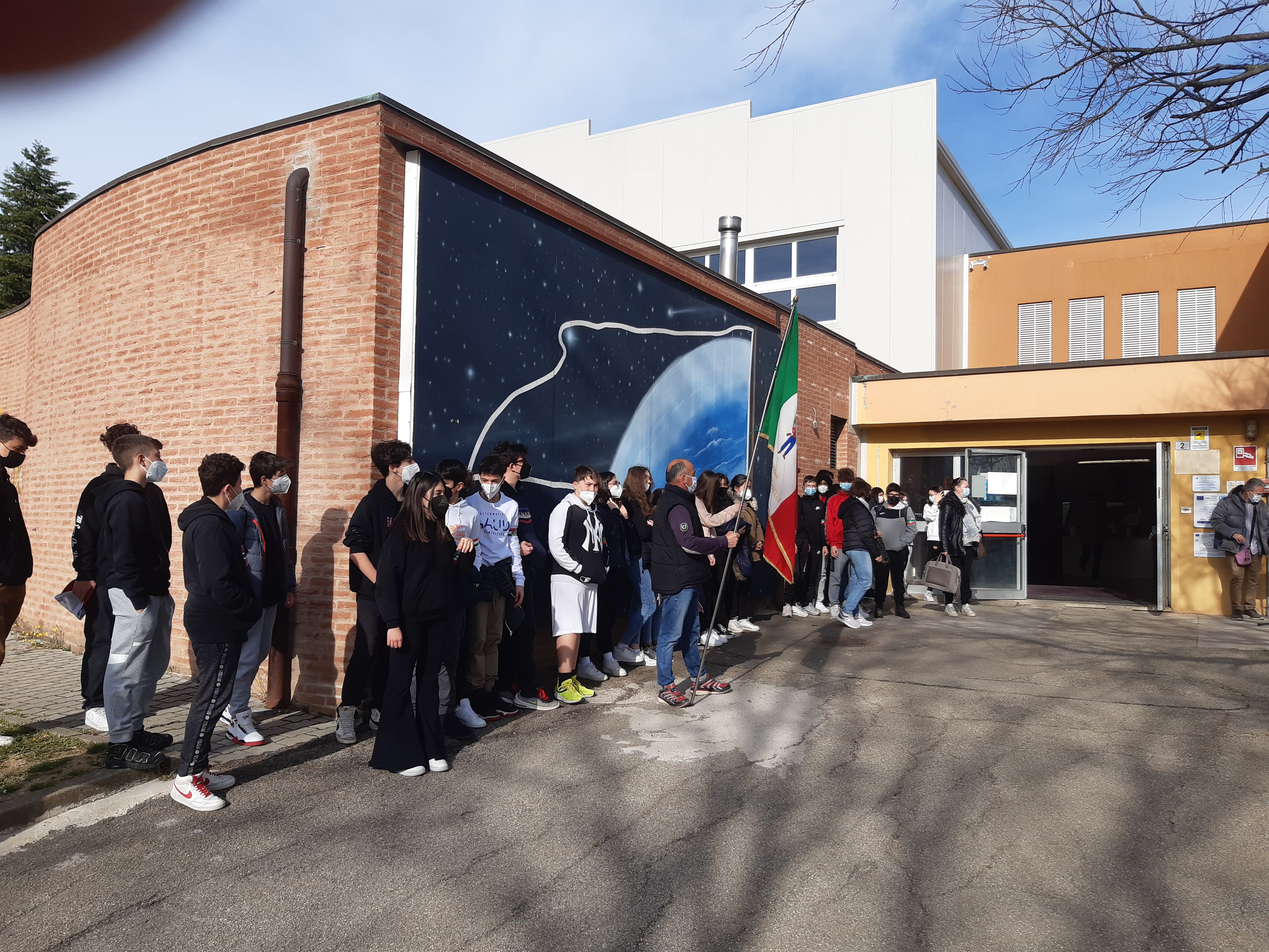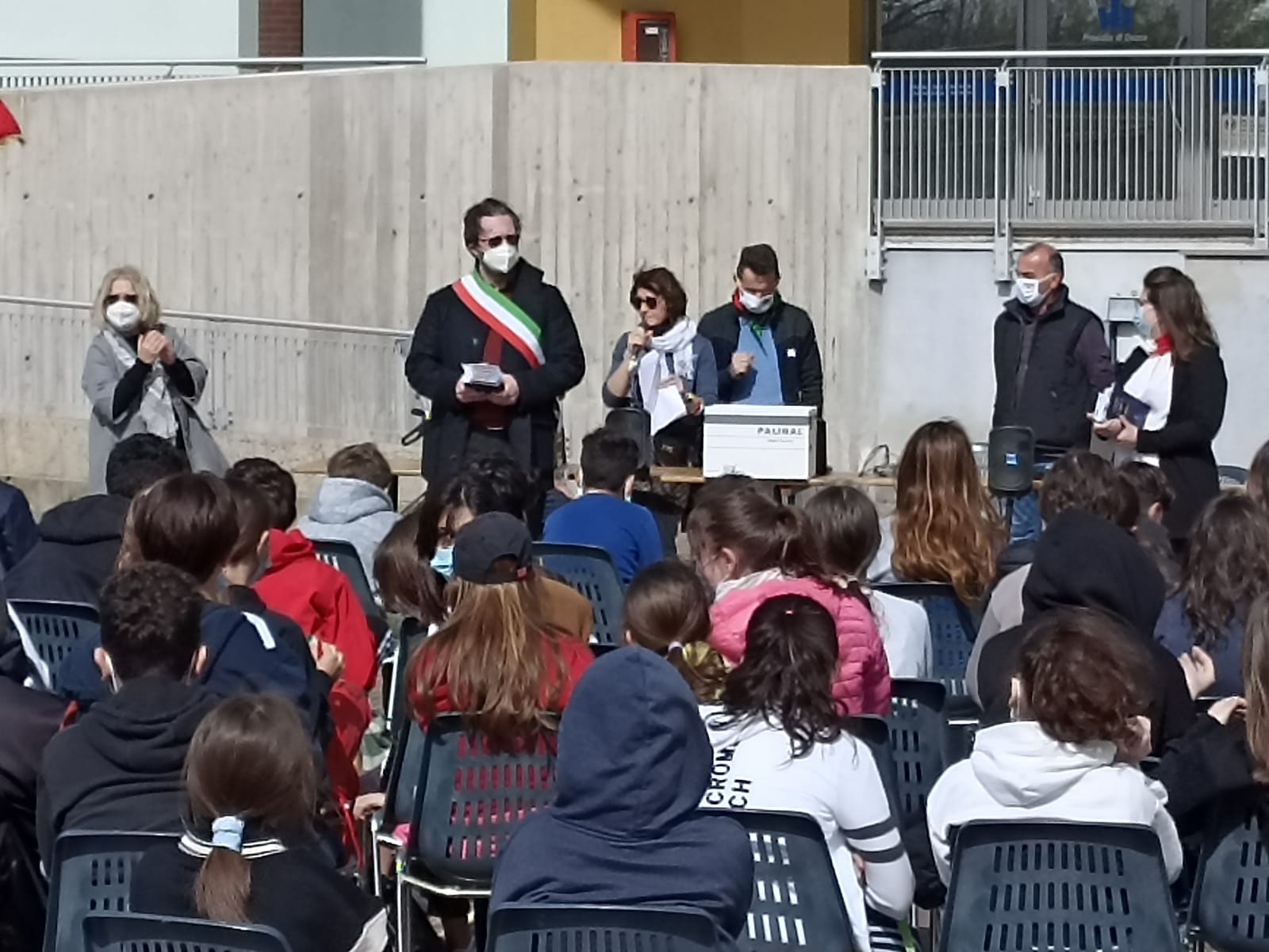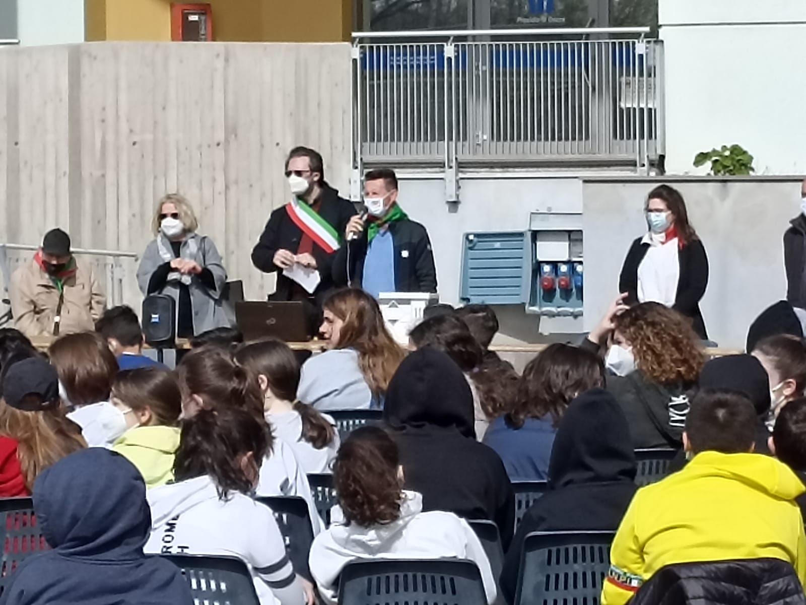inaugurazione della lapide in ricordo di Andrea Gualandi, classi II A,B e C della Scuola Secondaria di I grado “Aldo Moro”- Progetto di arte pubblica per il 70° della Liberazione ideato da Annalisa Cattani, promosso dai dieci Comuni del Distretto culturale imolesi in collaborazione con Anpi, Cidra e Musei civici di Imola.