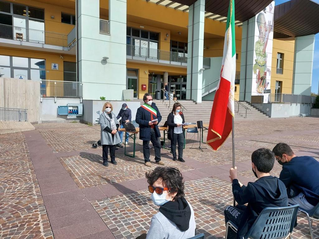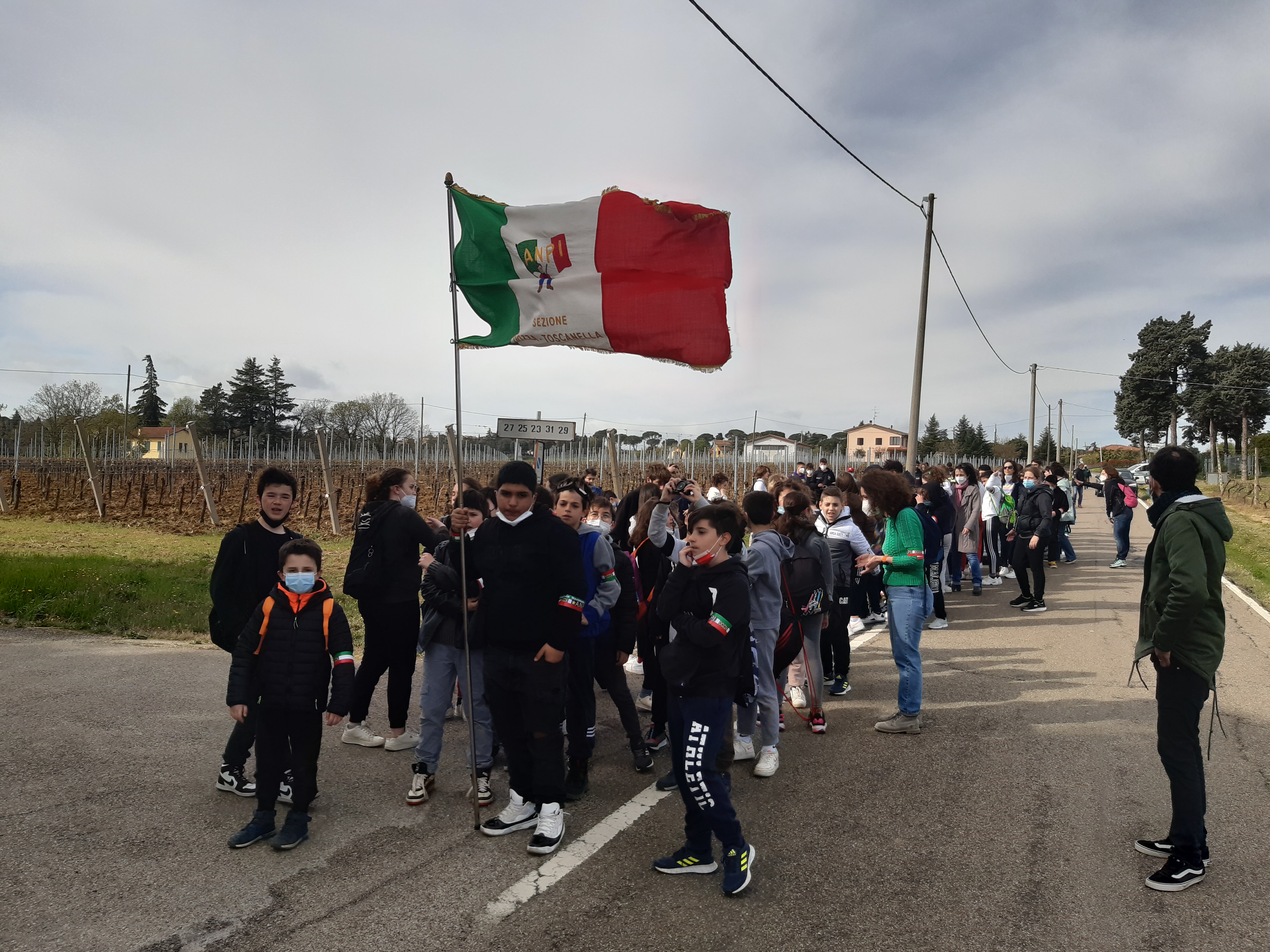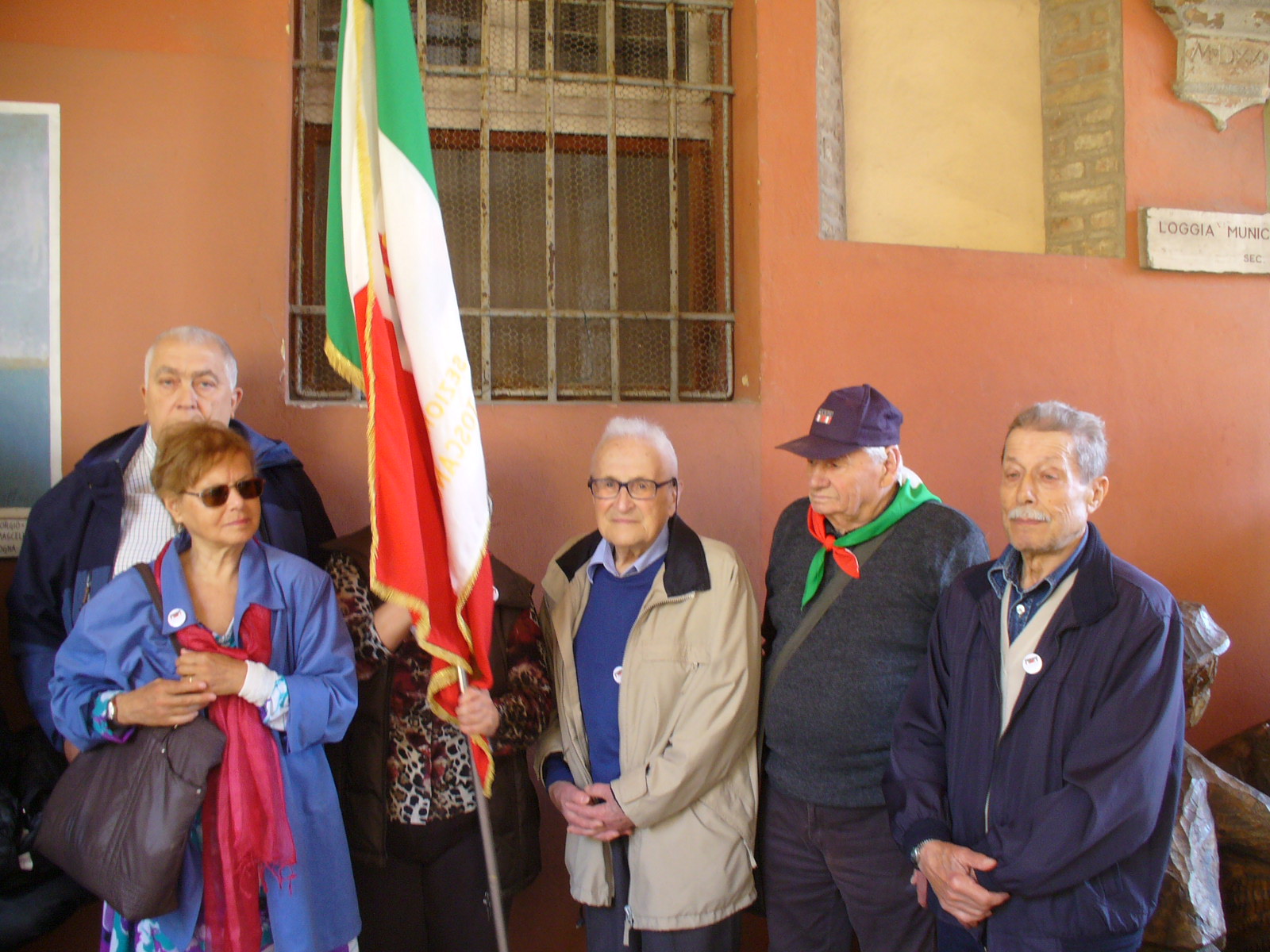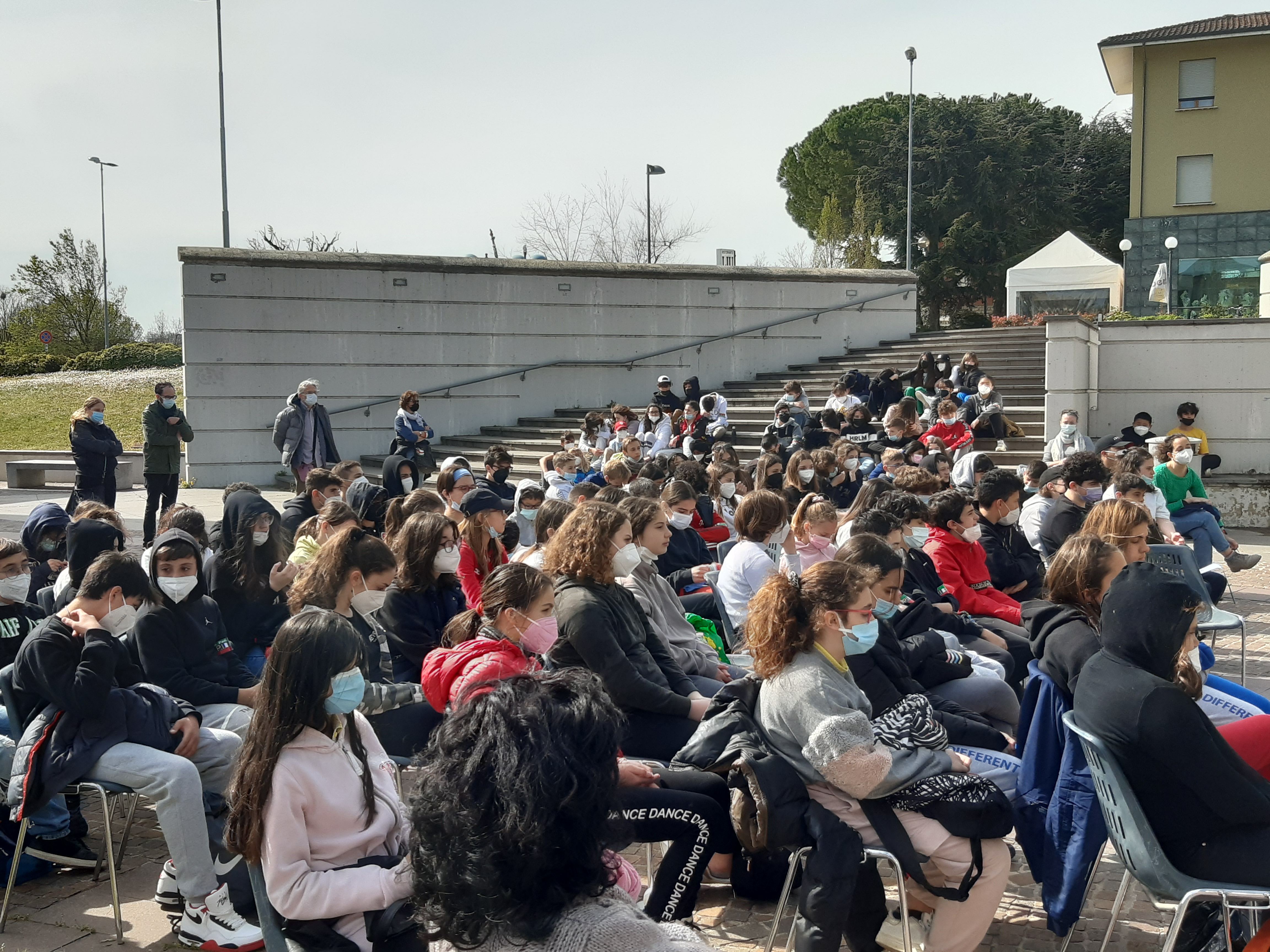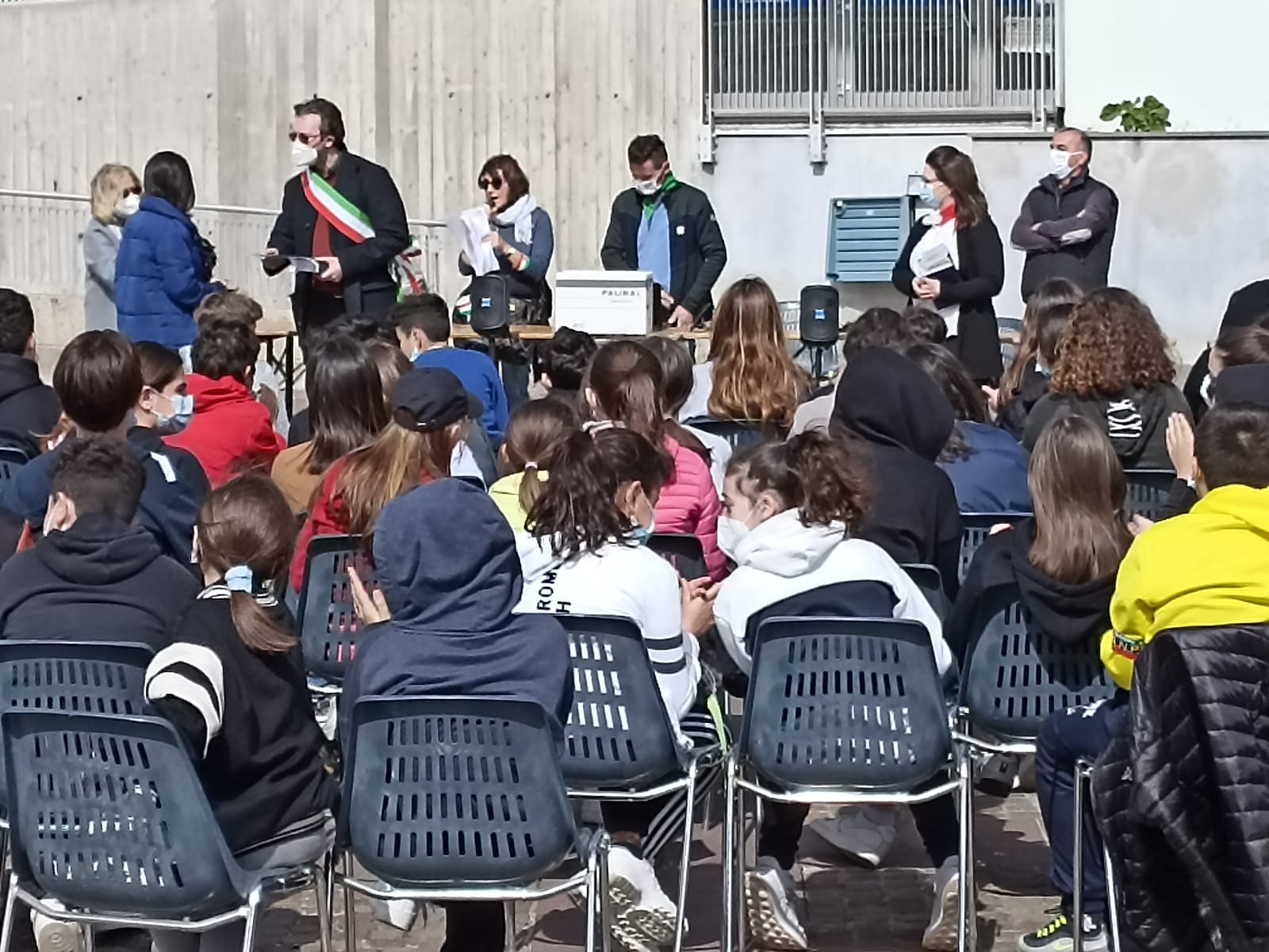 inaugurazione della lapide in ricordo di Andrea Gualandi, classi II A,B e C della Scuola Secondaria di I grado “Aldo Moro”- Progetto di arte pubblica per il 70° della Liberazione ideato da Annalisa Cattani, promosso dai dieci Comuni del Distretto culturale imolesi in collaborazione con Anpi, Cidra e Musei civici di Imola.