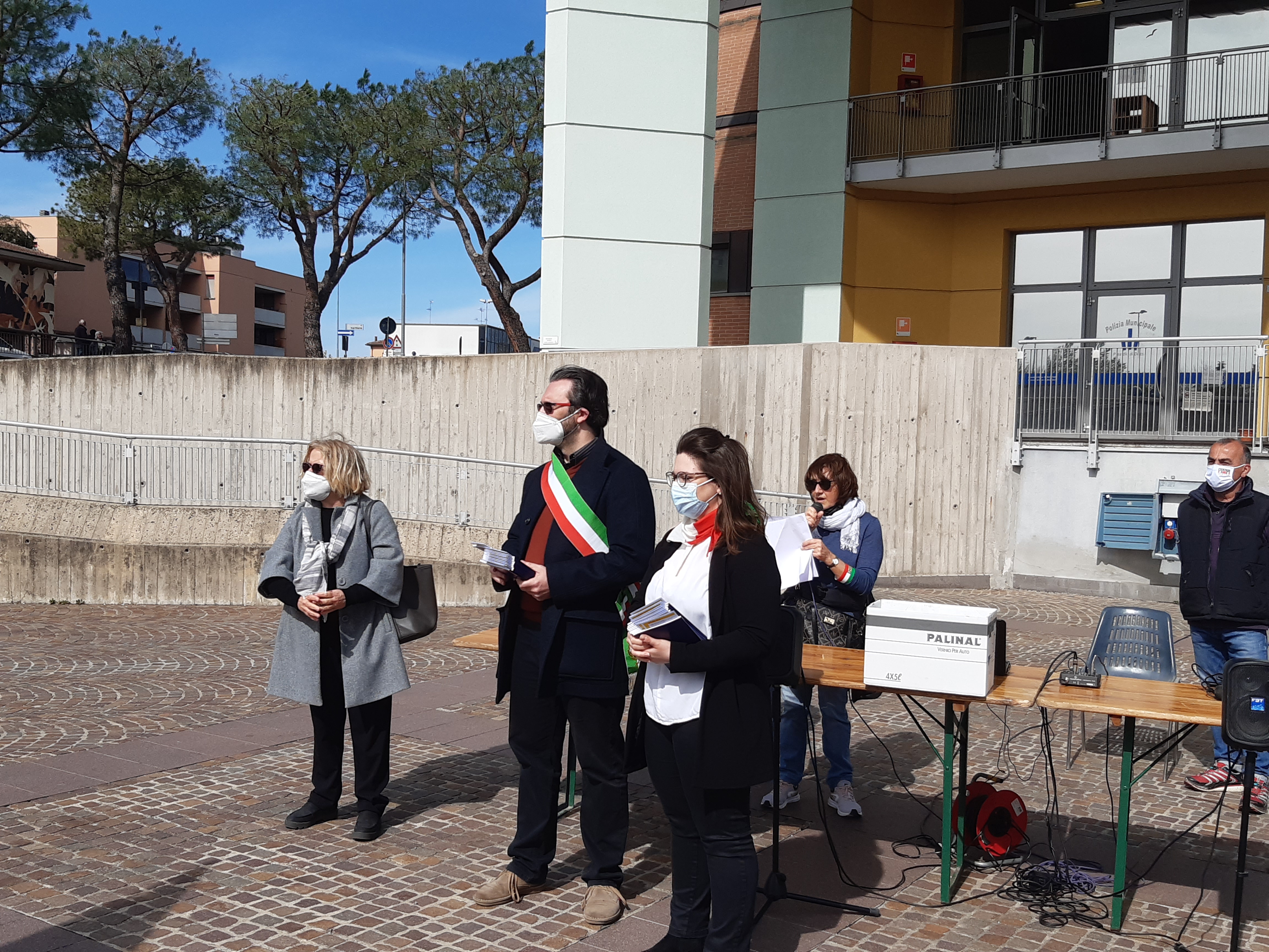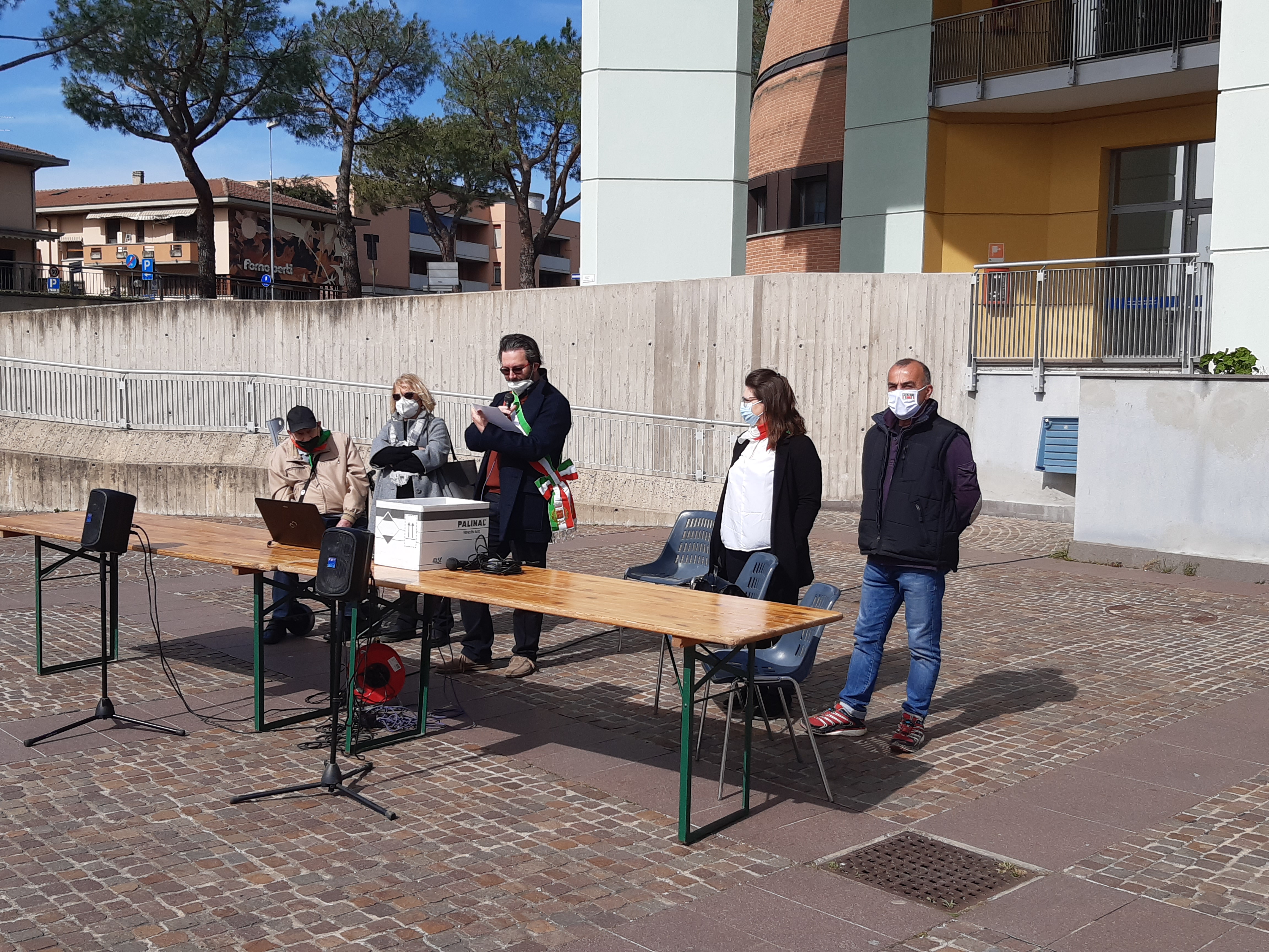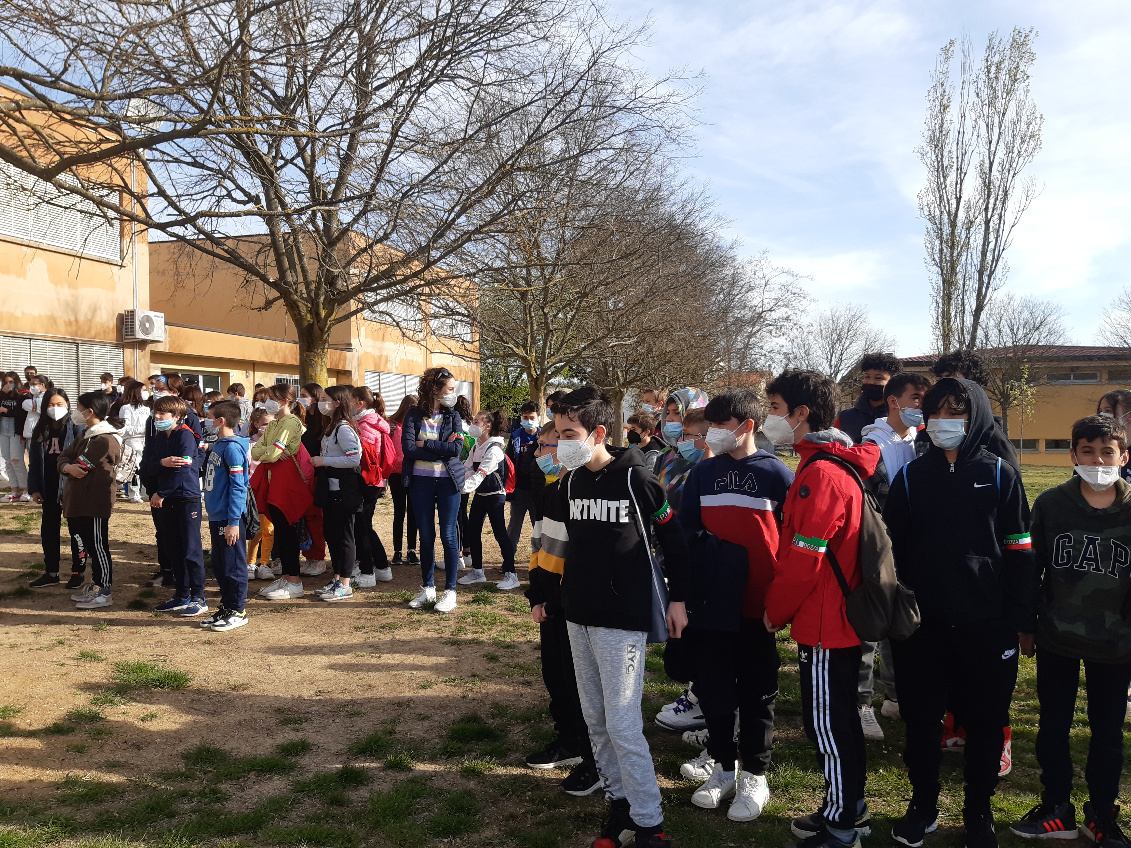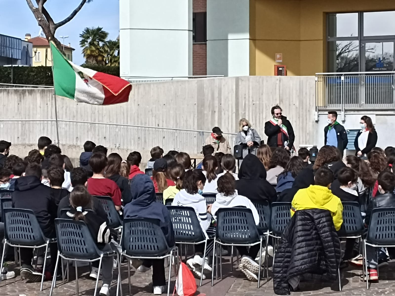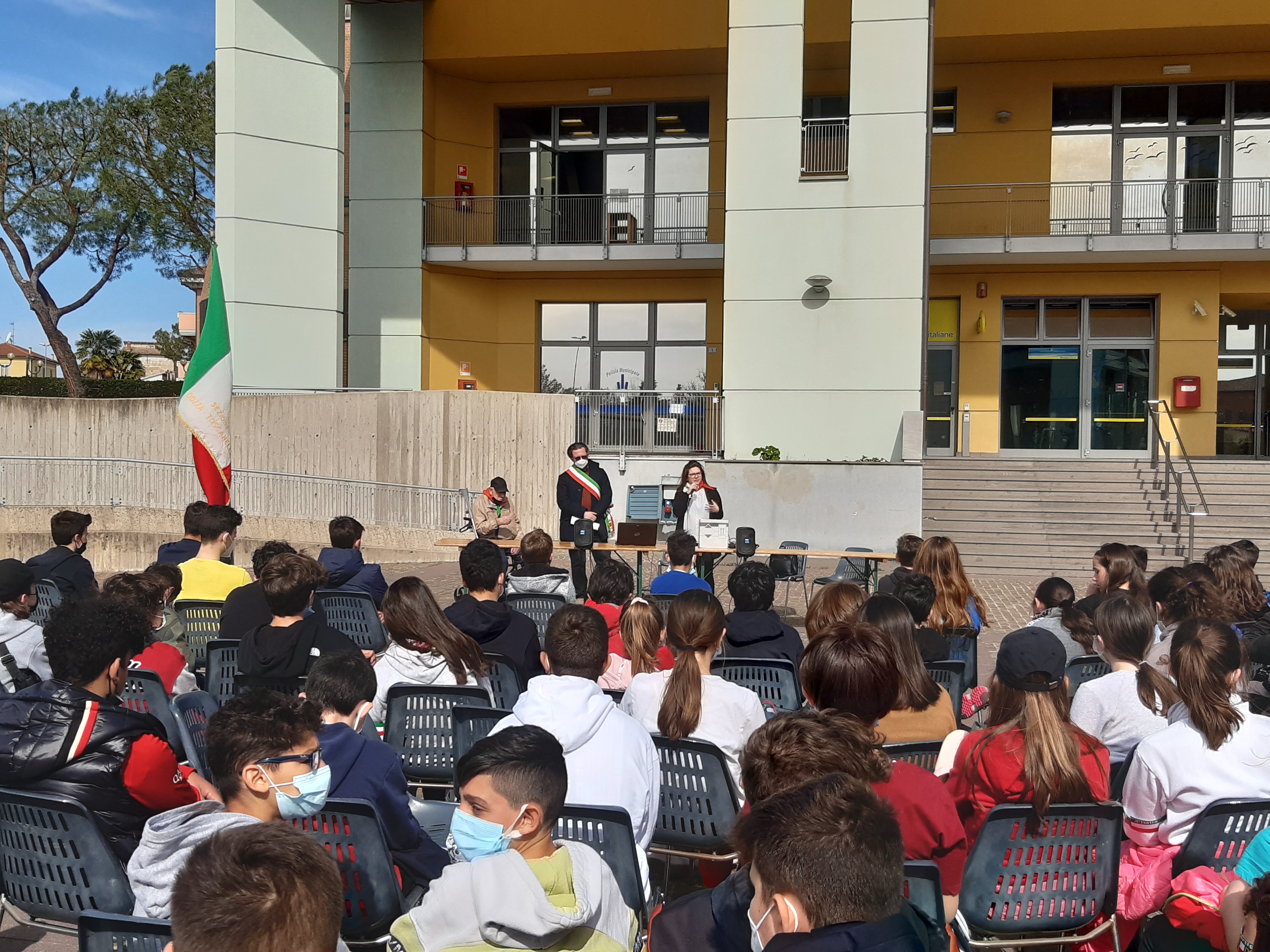 inaugurazione della lapide in ricordo di Andrea Gualandi, classi II A,B e C della Scuola Secondaria di I grado “Aldo Moro”- Progetto di arte pubblica per il 70° della Liberazione ideato da Annalisa Cattani, promosso dai dieci Comuni del Distretto culturale imolesi in collaborazione con Anpi, Cidra e Musei civici di Imola.