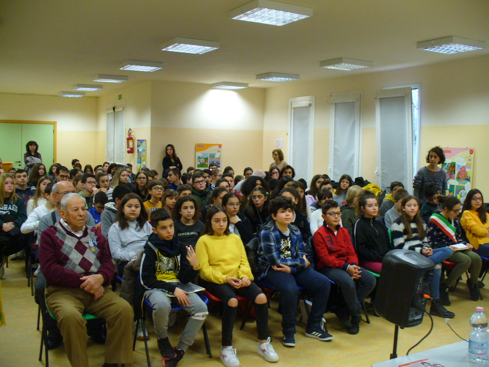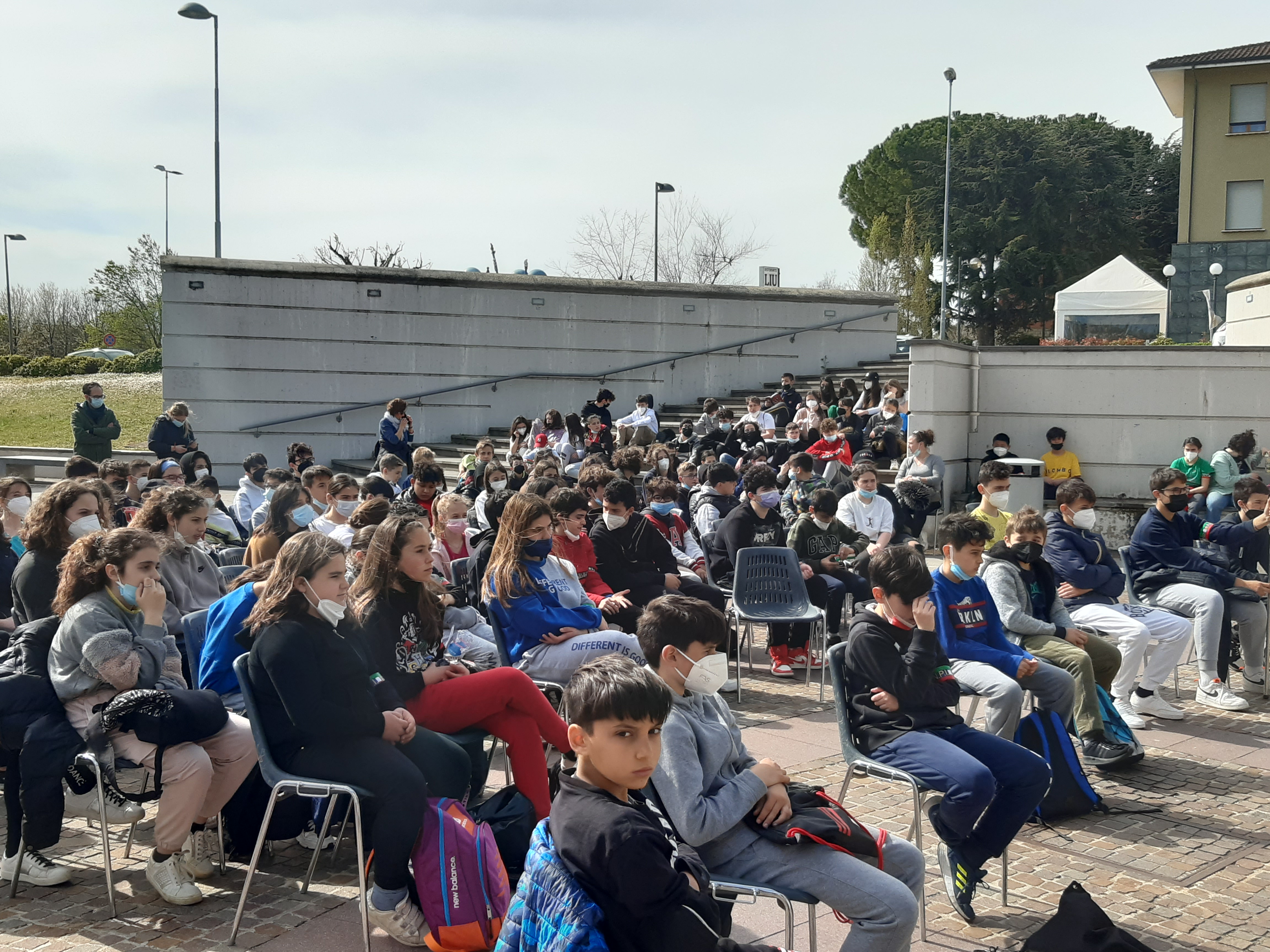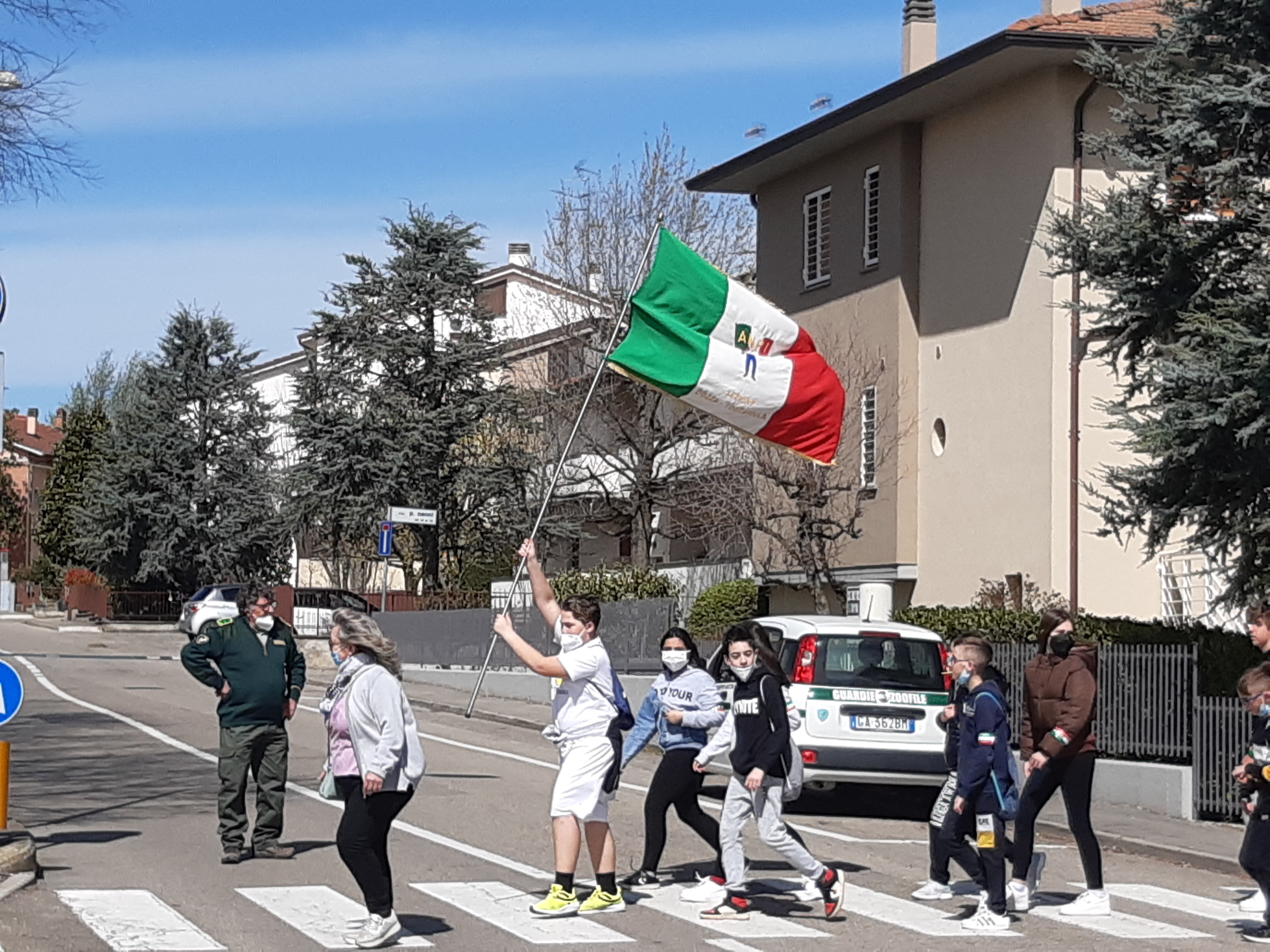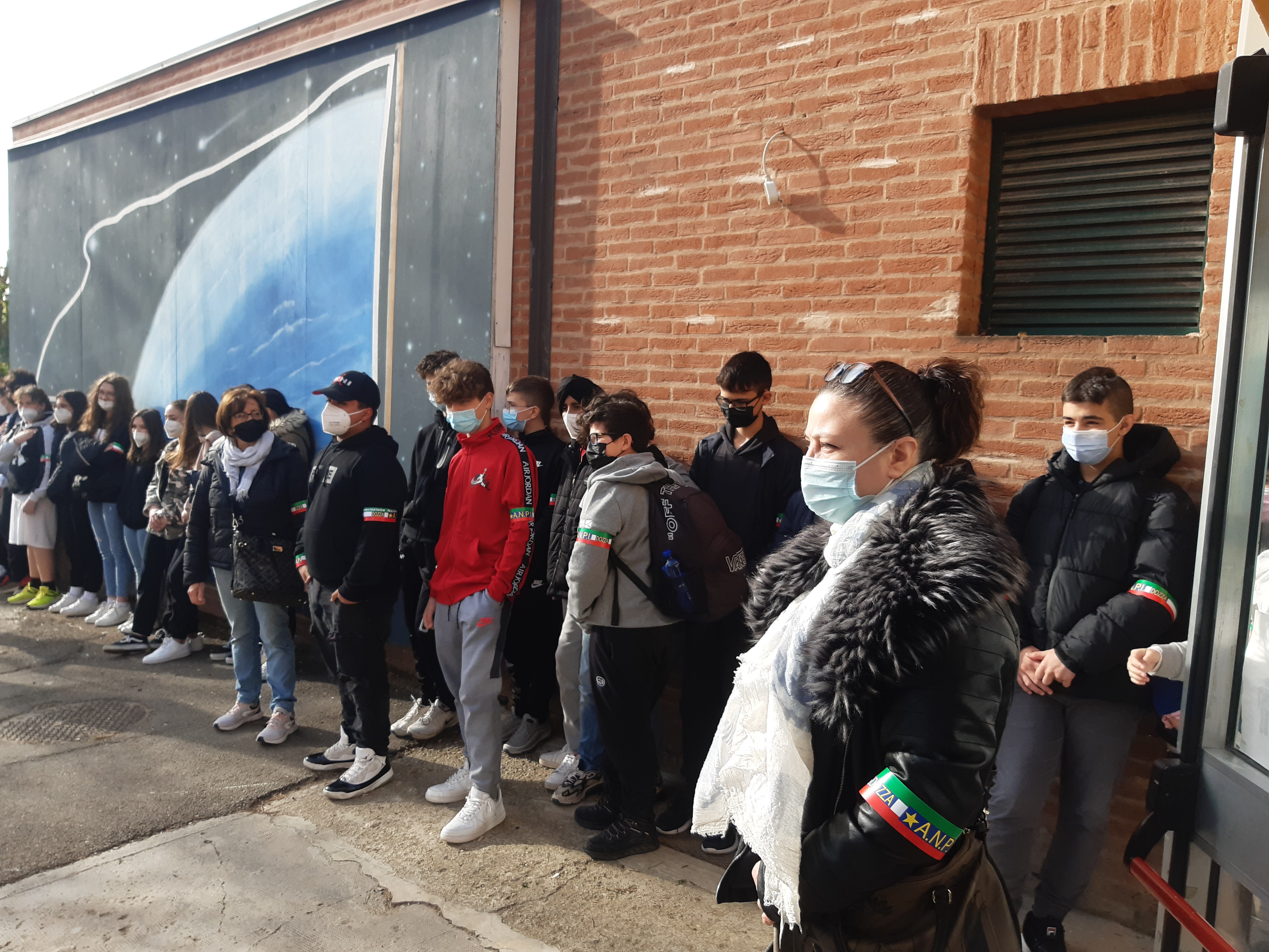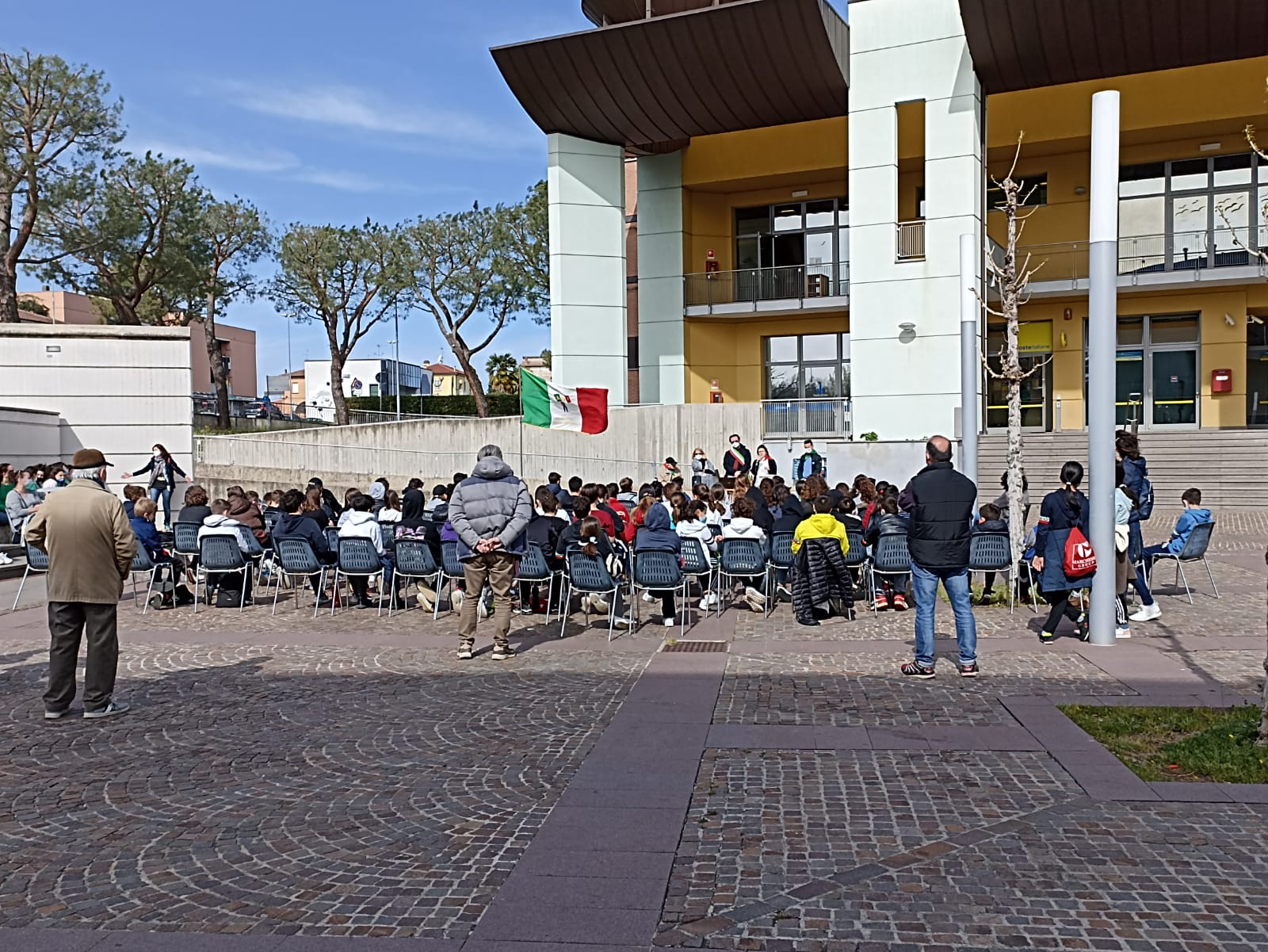 inaugurazione della lapide in ricordo di Andrea Gualandi, classi II A,B e C della Scuola Secondaria di I grado “Aldo Moro”- Progetto di arte pubblica per il 70° della Liberazione ideato da Annalisa Cattani, promosso dai dieci Comuni del Distretto culturale imolesi in collaborazione con Anpi, Cidra e Musei civici di Imola.