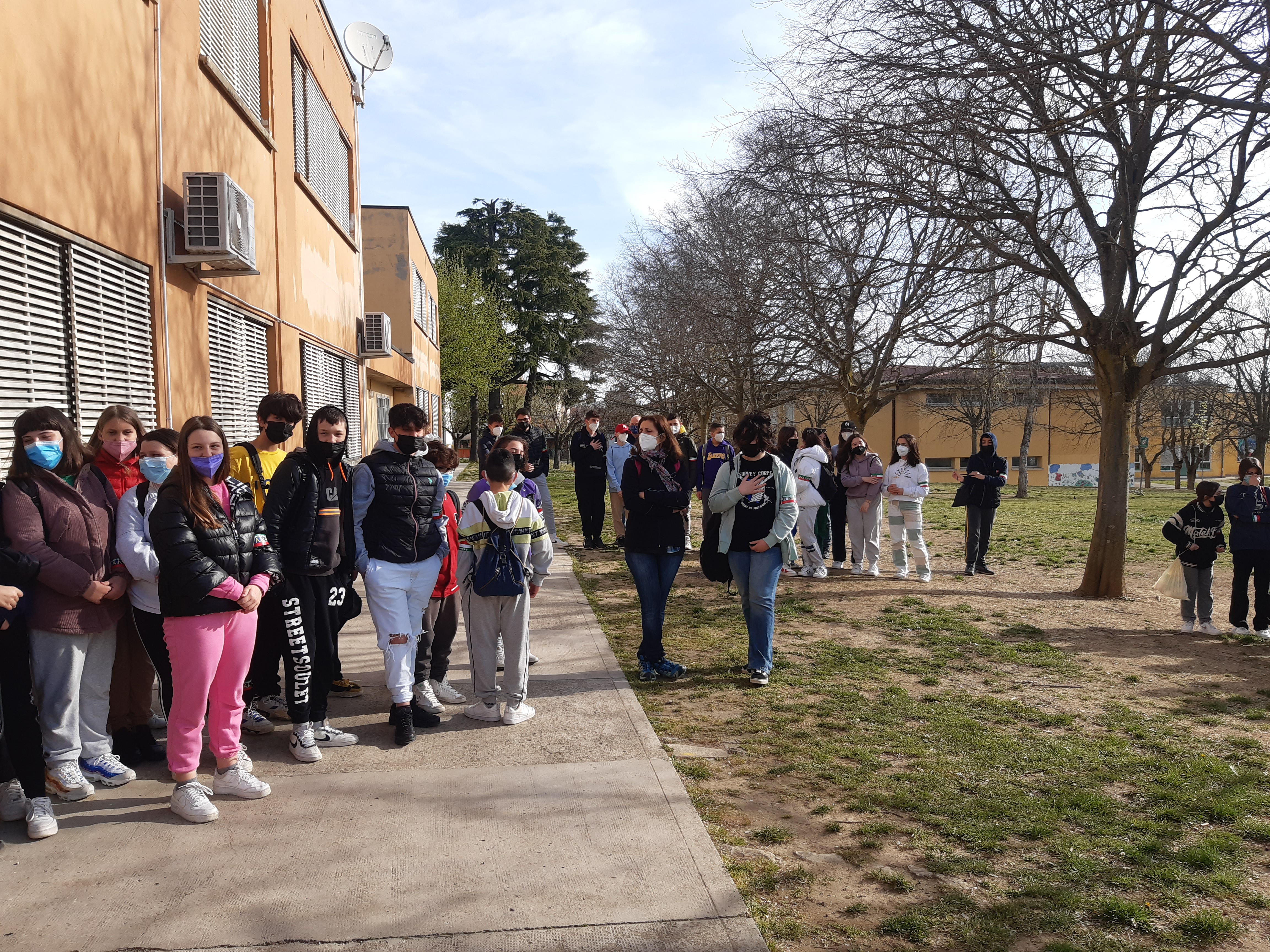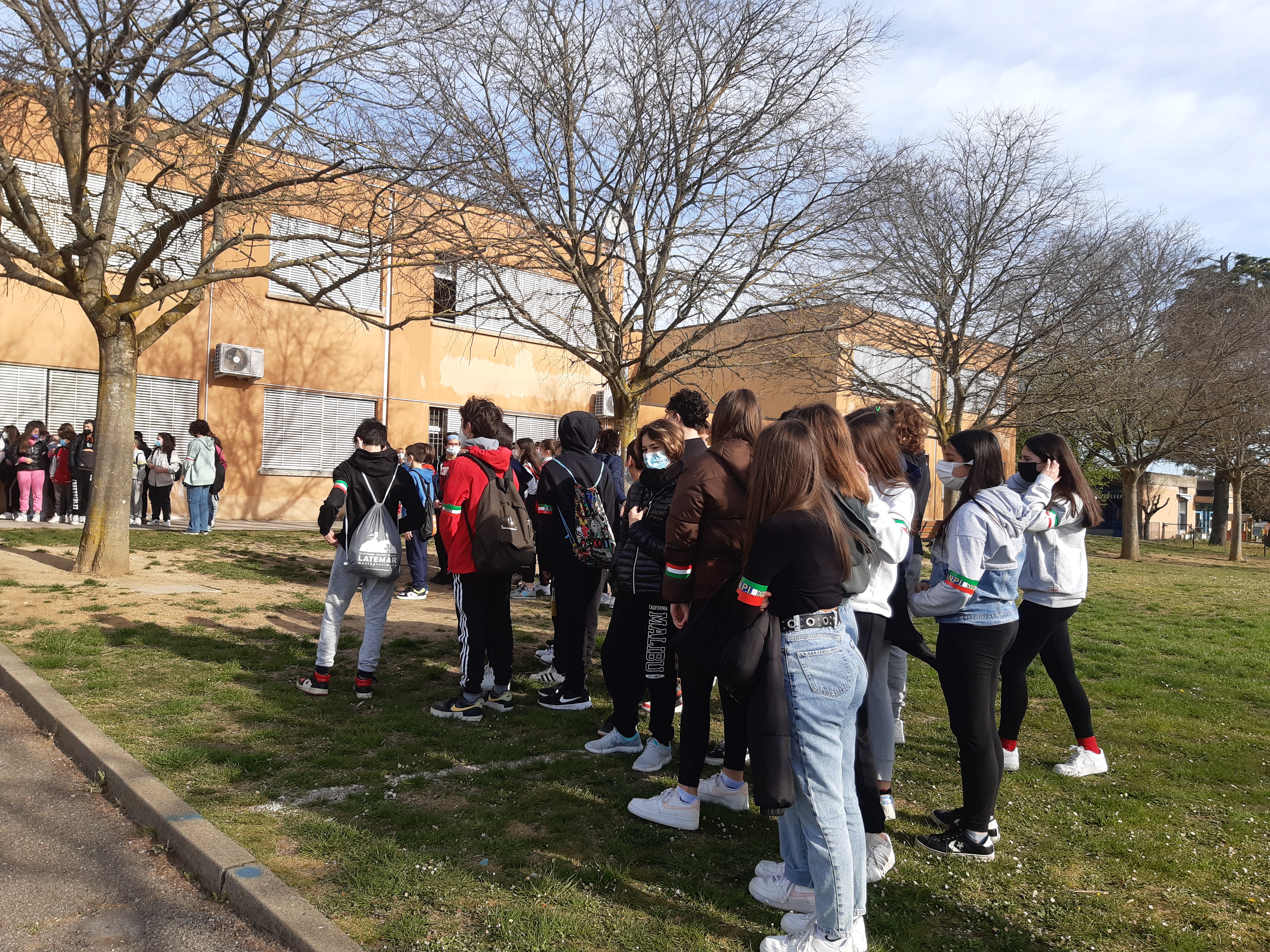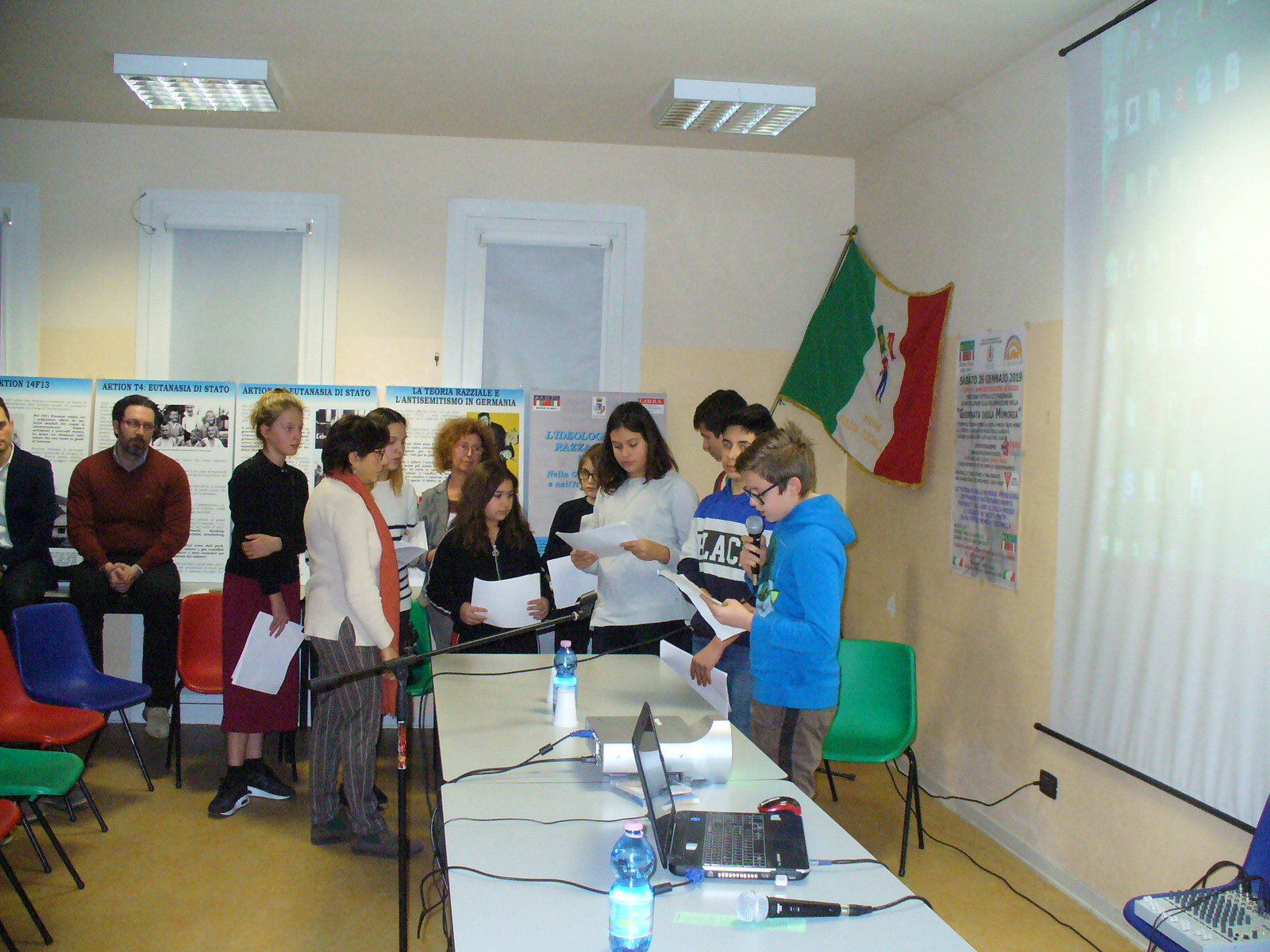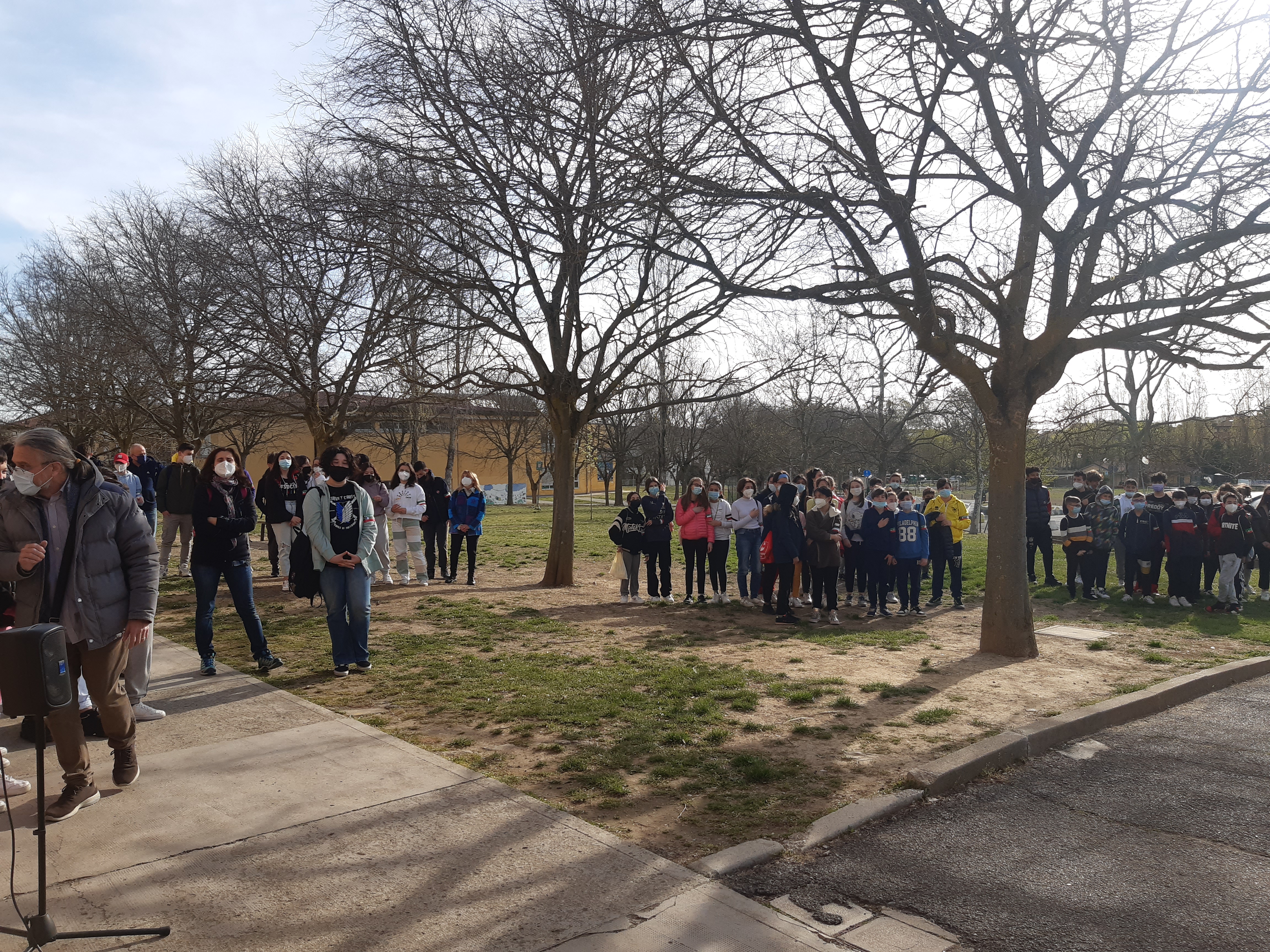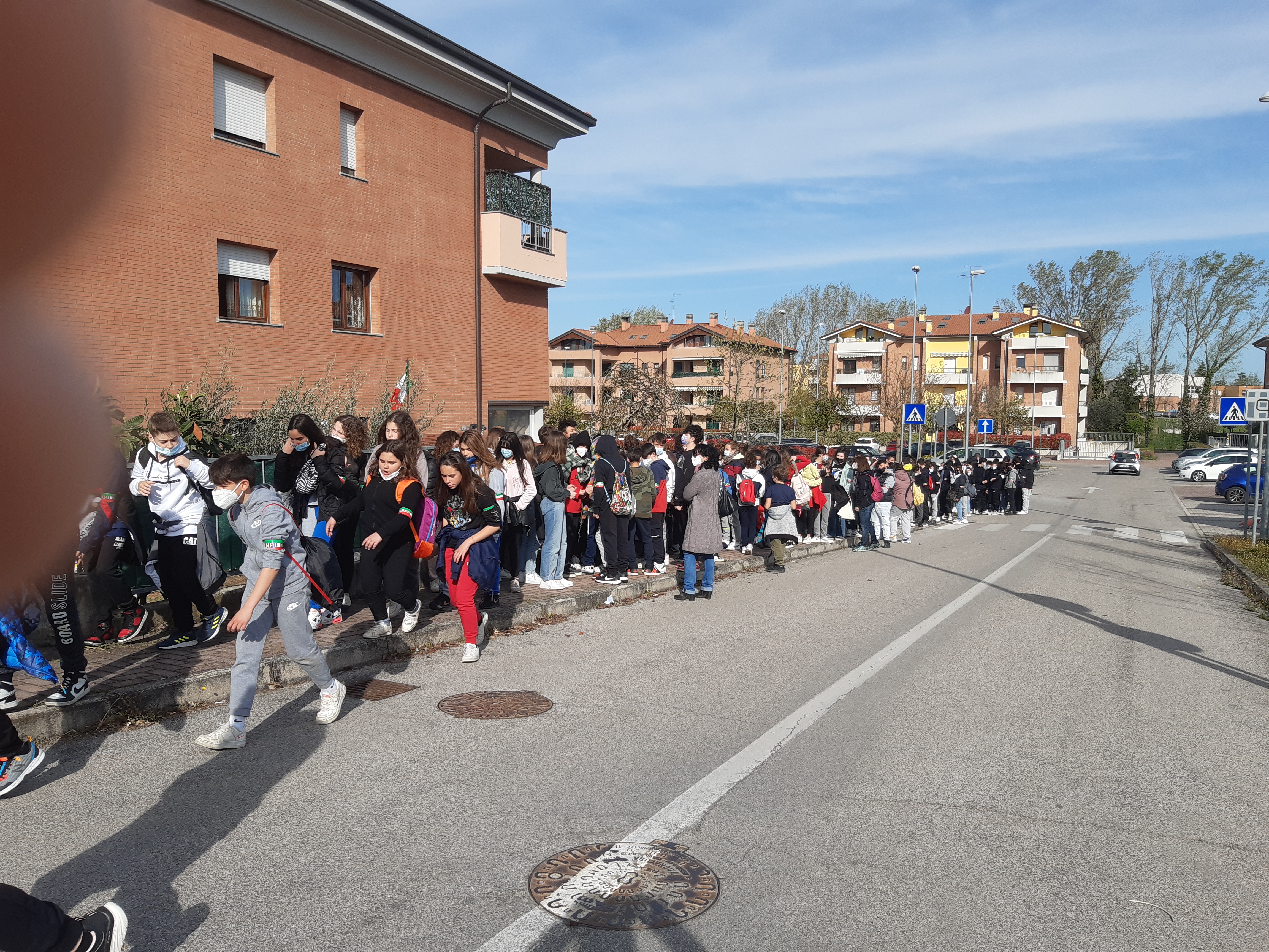 inaugurazione della lapide in ricordo di Andrea Gualandi, classi II A,B e C della Scuola Secondaria di I grado “Aldo Moro”- Progetto di arte pubblica per il 70° della Liberazione ideato da Annalisa Cattani, promosso dai dieci Comuni del Distretto culturale imolesi in collaborazione con Anpi, Cidra e Musei civici di Imola.