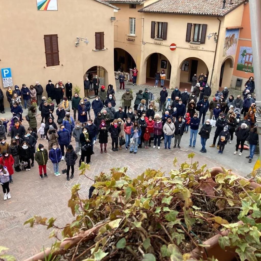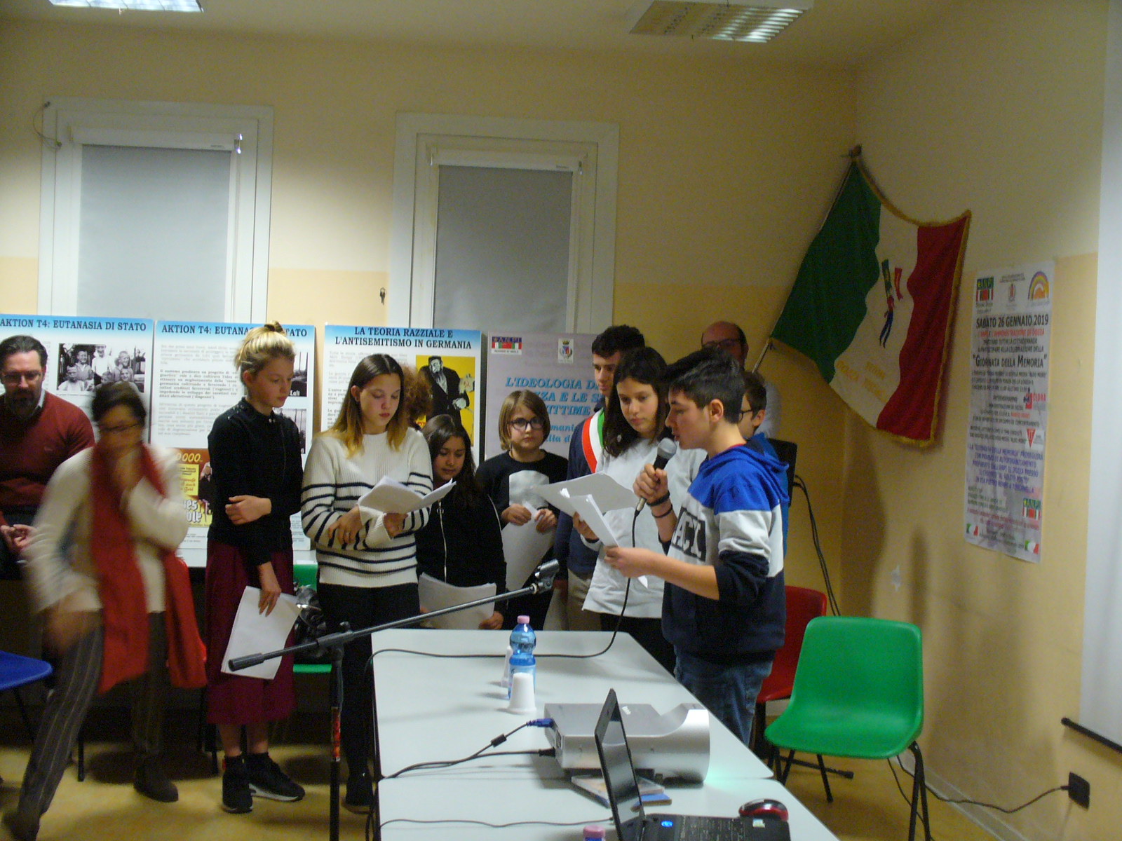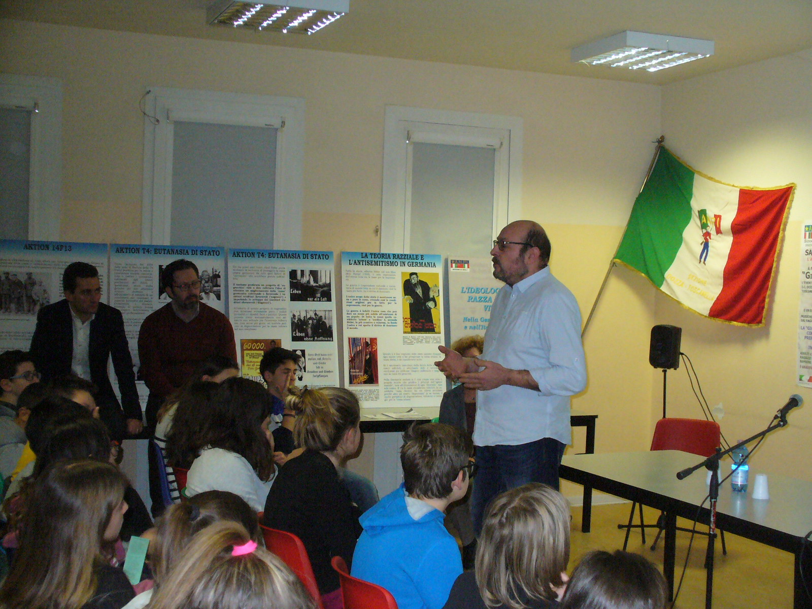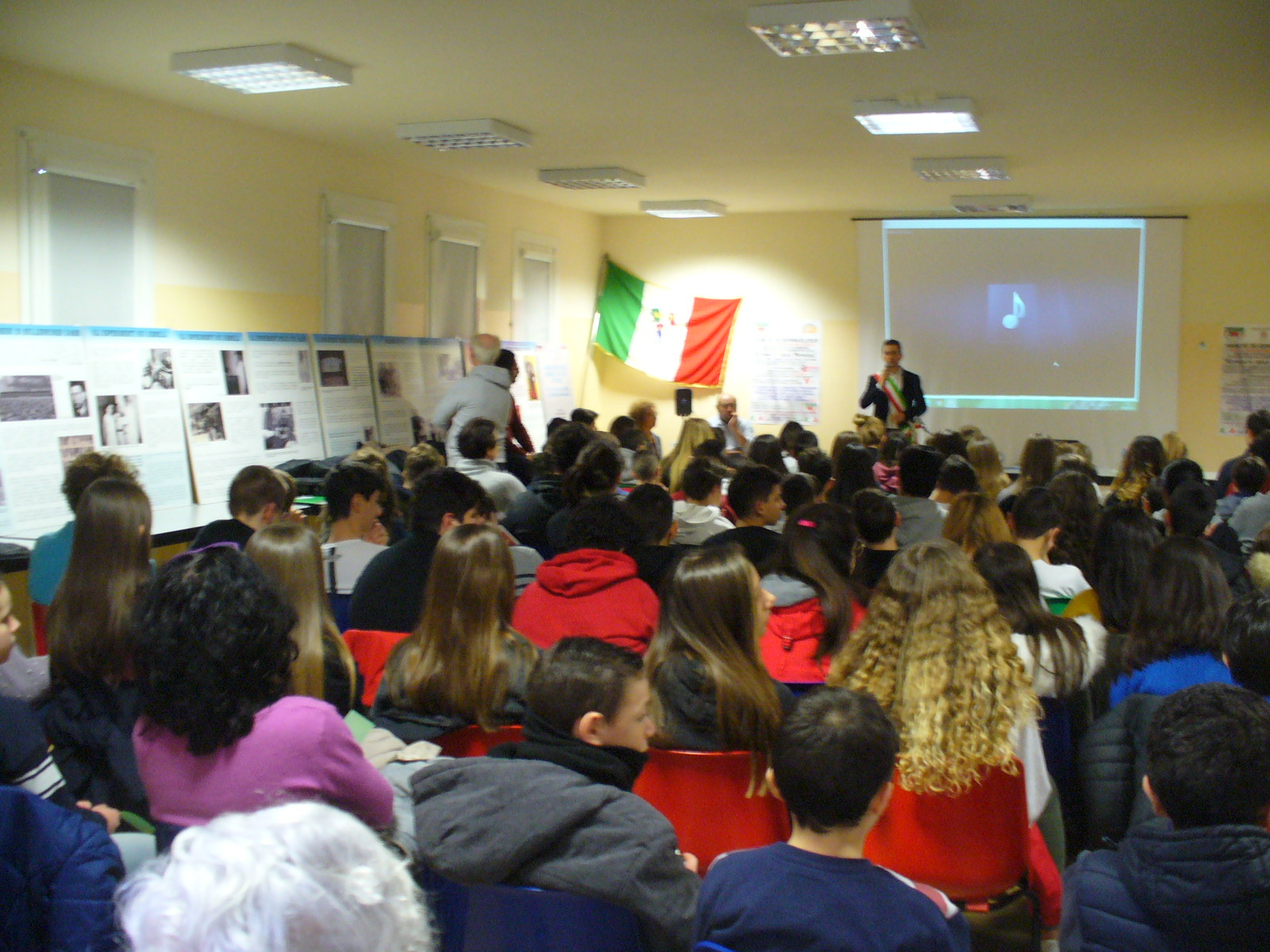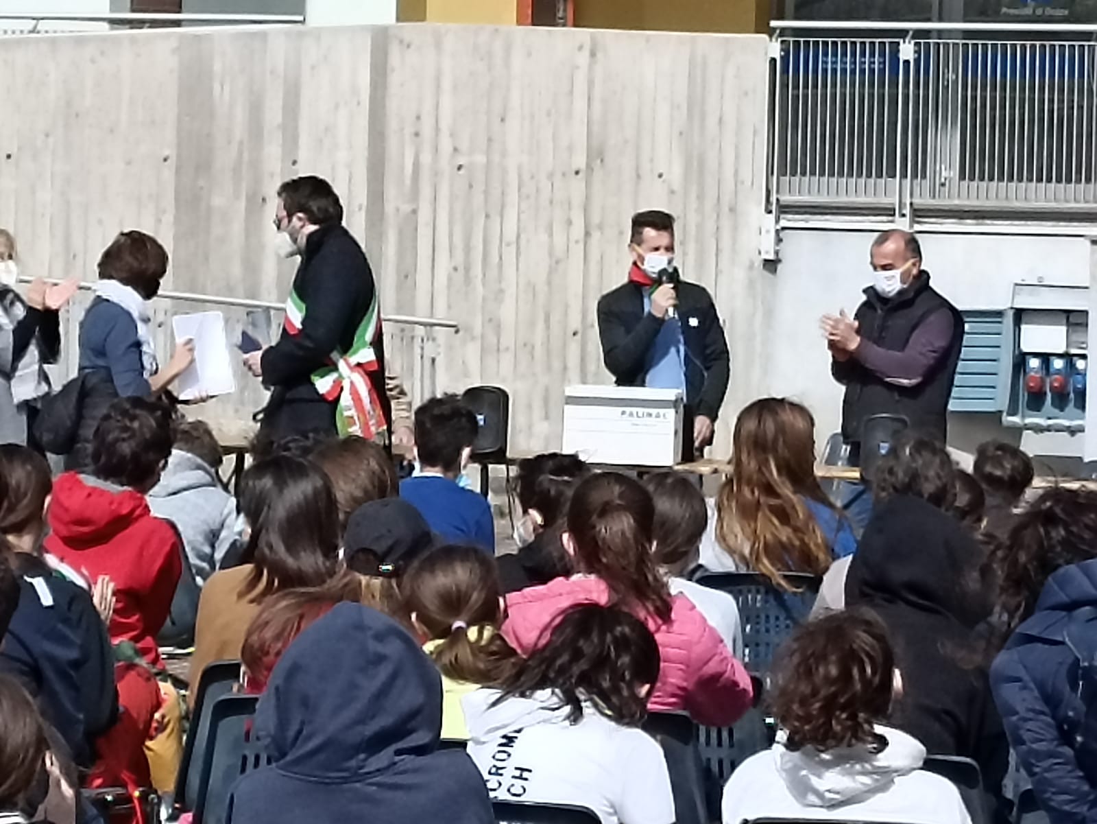 inaugurazione della lapide in ricordo di Andrea Gualandi, classi II A,B e C della Scuola Secondaria di I grado “Aldo Moro”- Progetto di arte pubblica per il 70° della Liberazione ideato da Annalisa Cattani, promosso dai dieci Comuni del Distretto culturale imolesi in collaborazione con Anpi, Cidra e Musei civici di Imola.