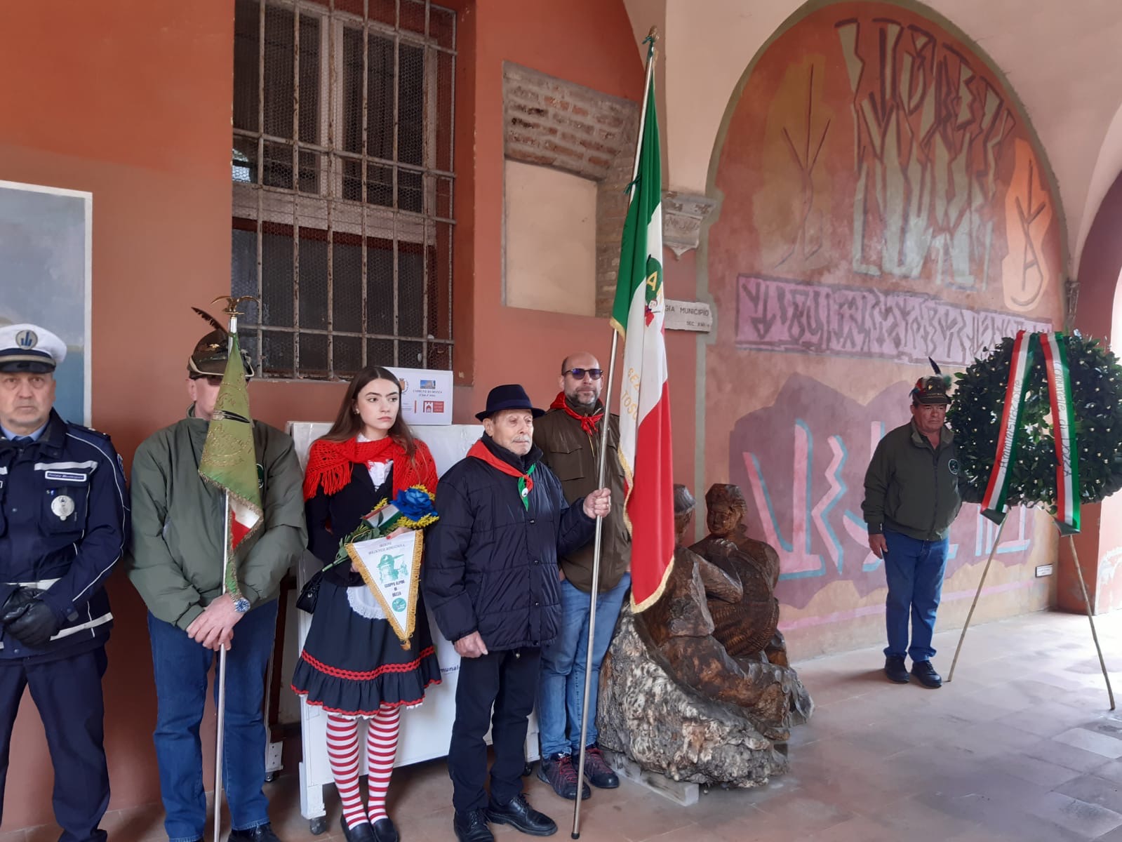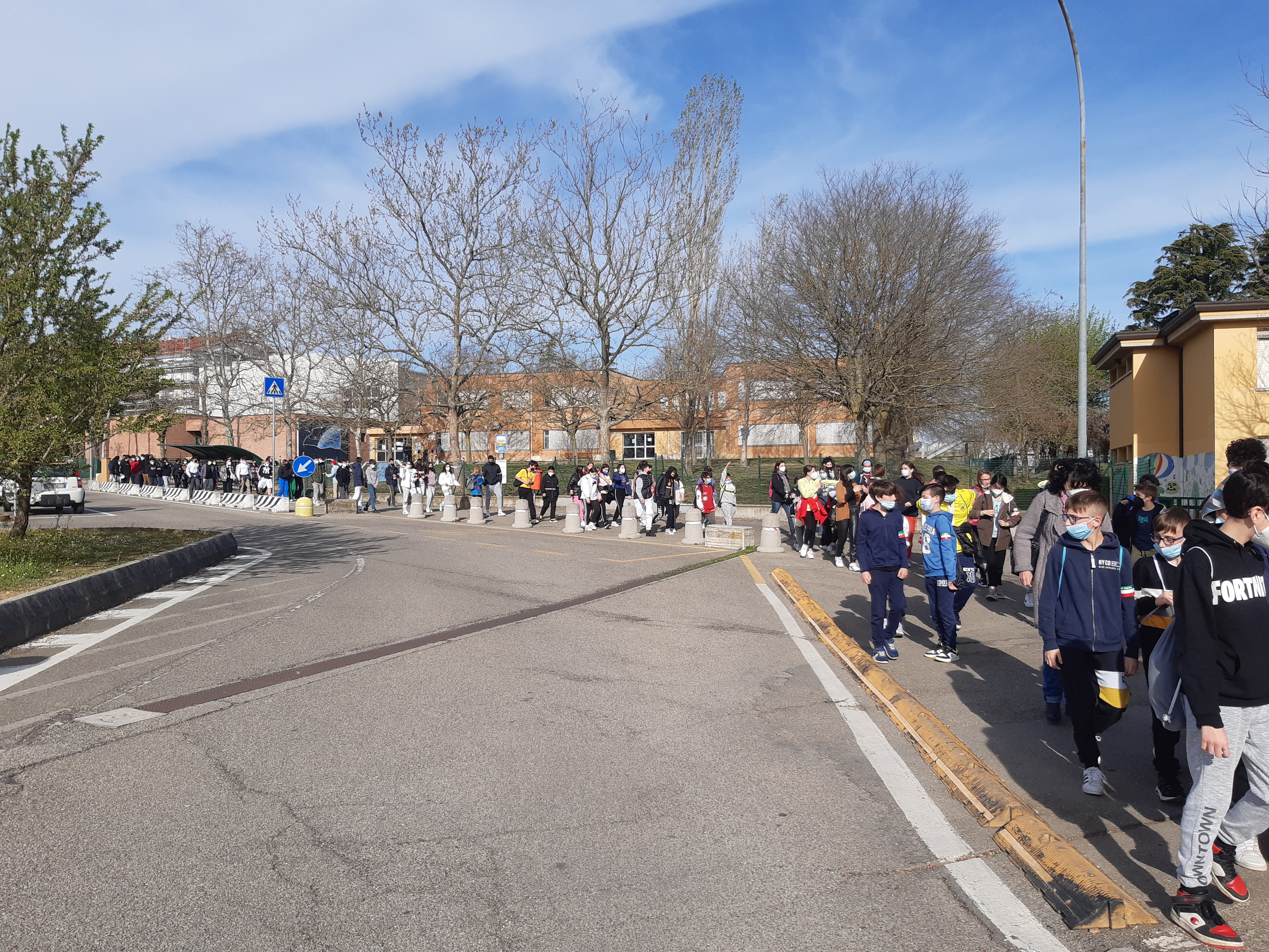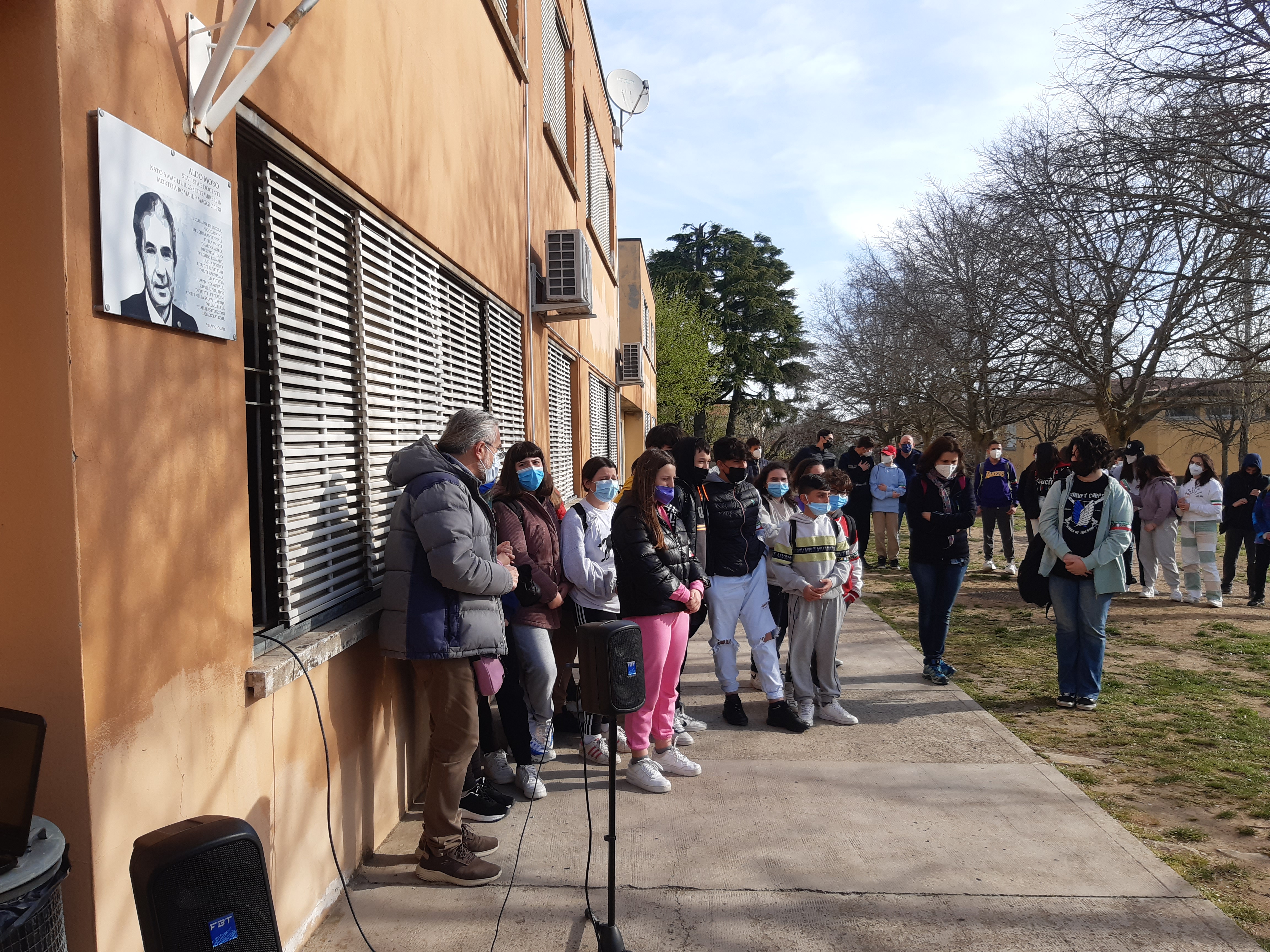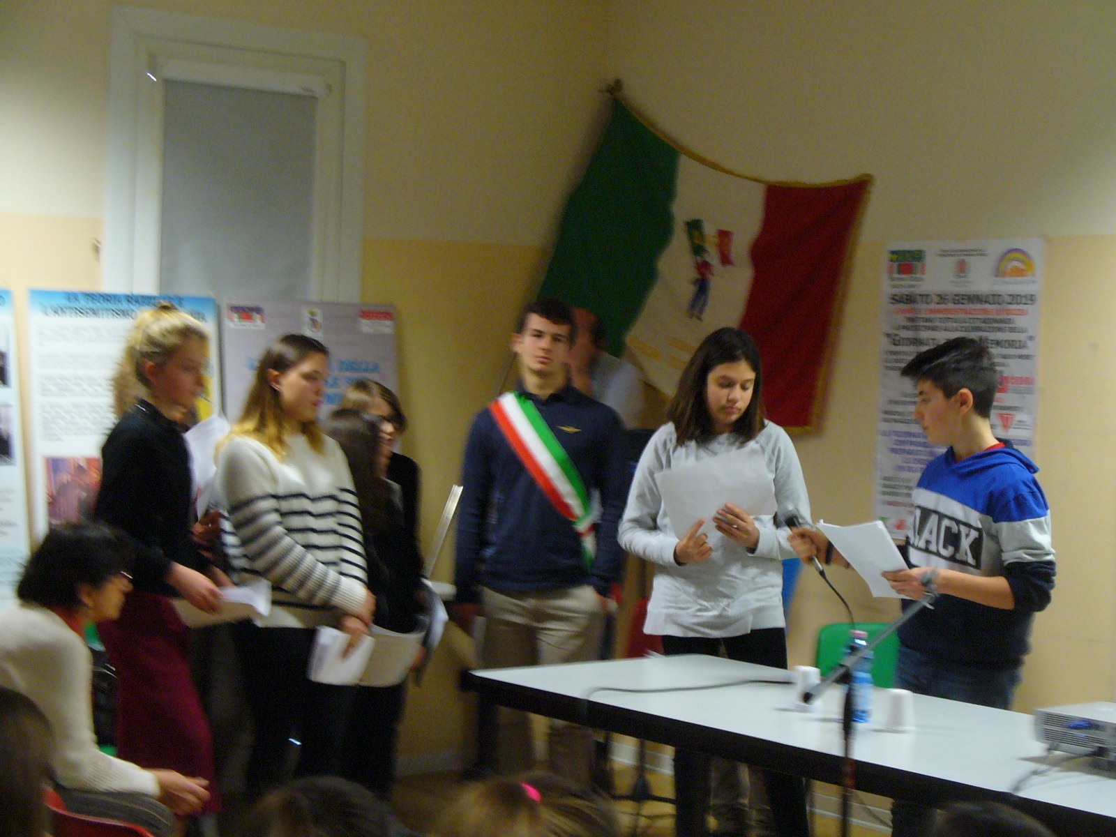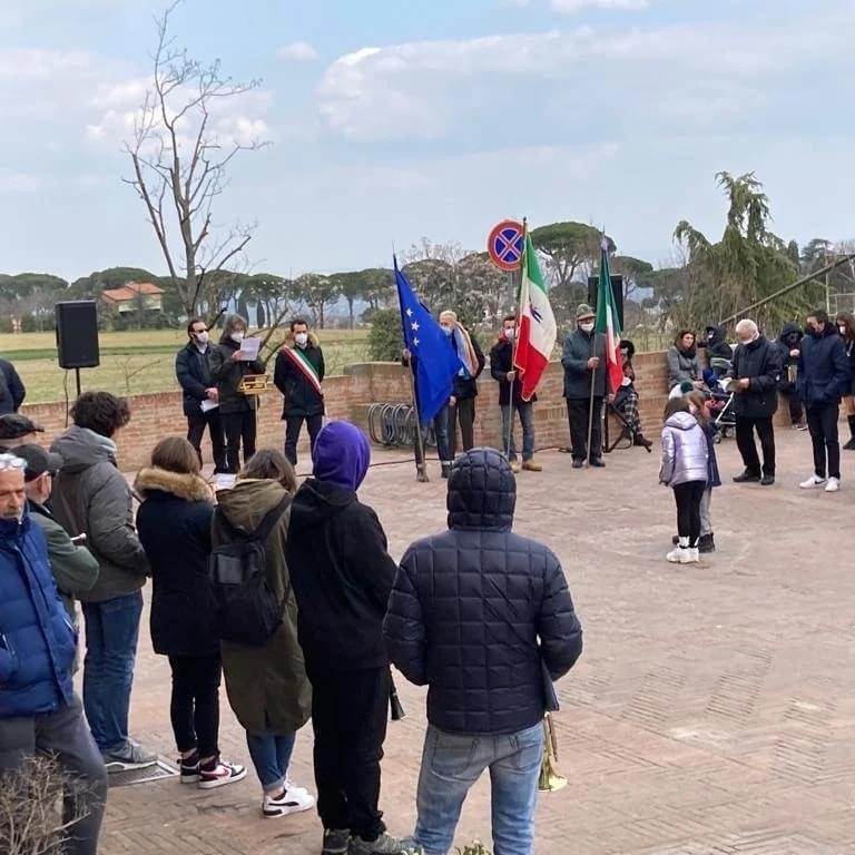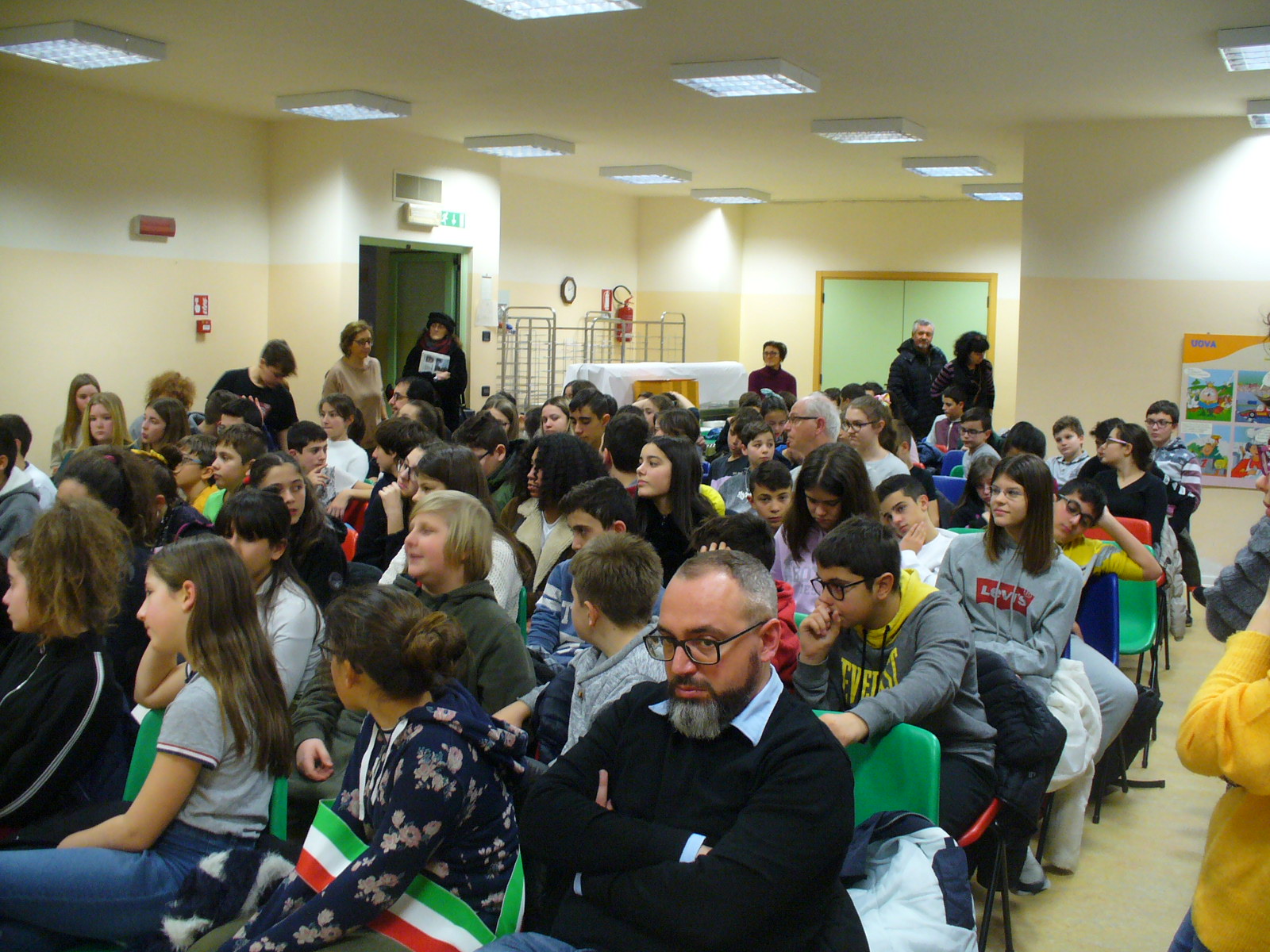 inaugurazione della lapide in ricordo di Andrea Gualandi, classi II A,B e C della Scuola Secondaria di I grado “Aldo Moro”- Progetto di arte pubblica per il 70° della Liberazione ideato da Annalisa Cattani, promosso dai dieci Comuni del Distretto culturale imolesi in collaborazione con Anpi, Cidra e Musei civici di Imola.