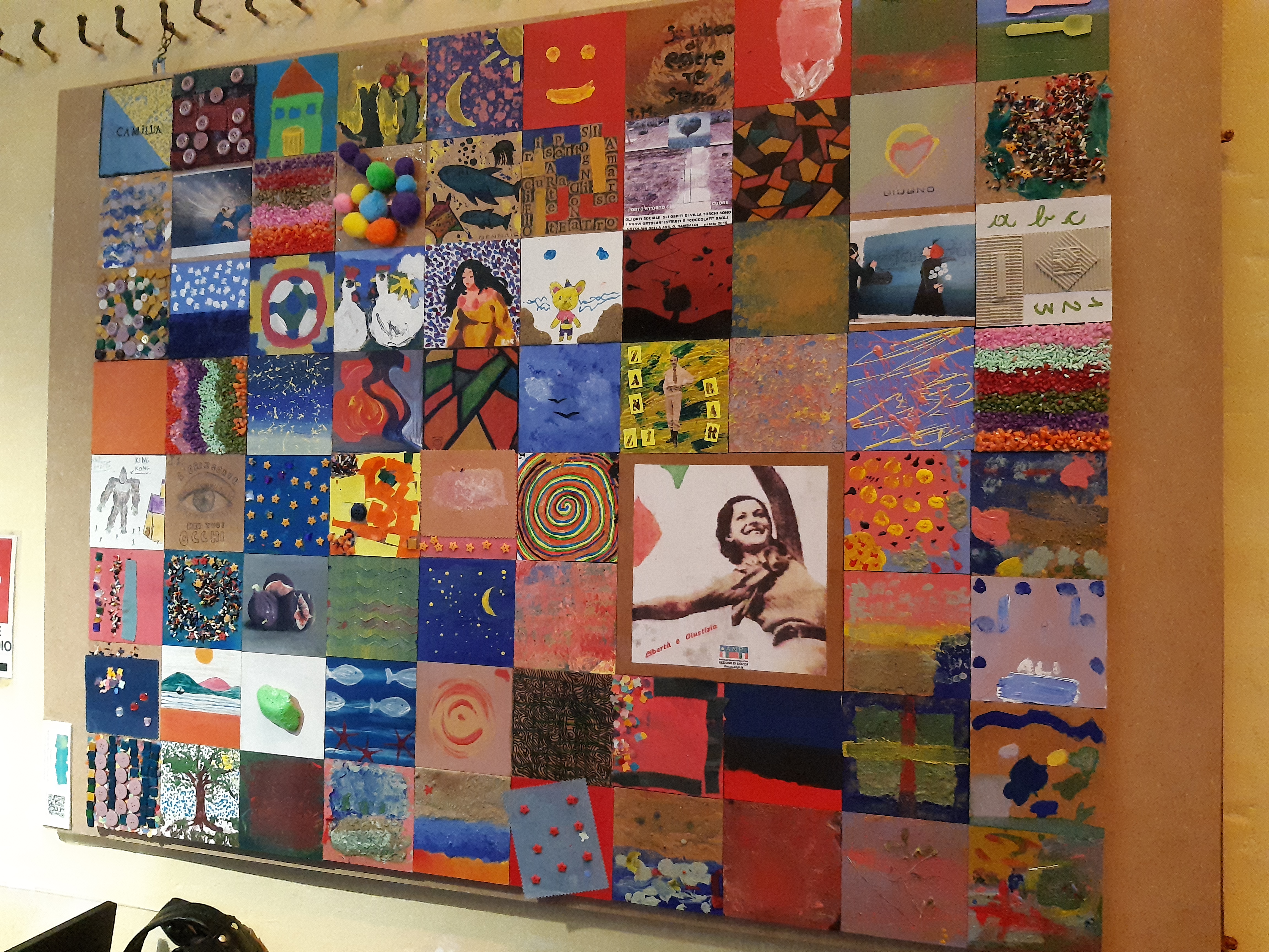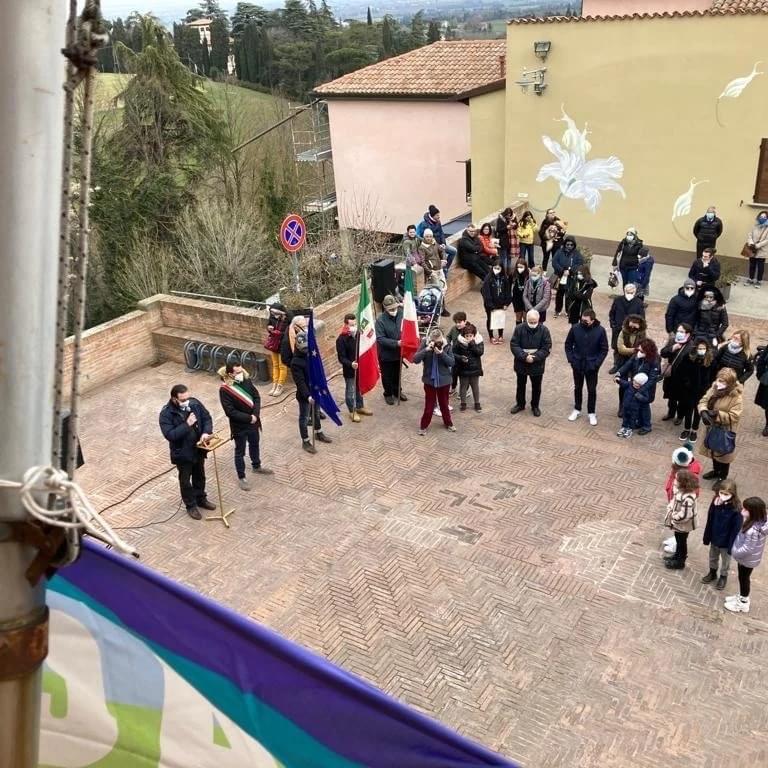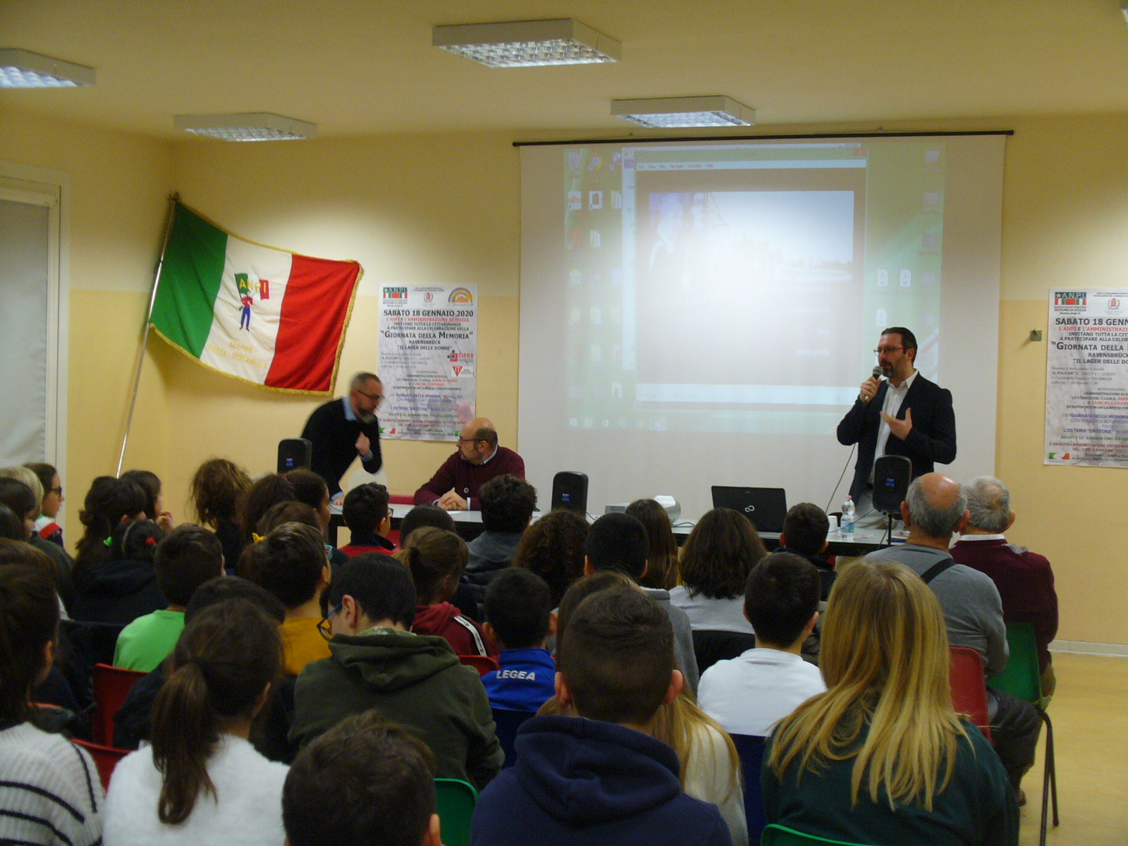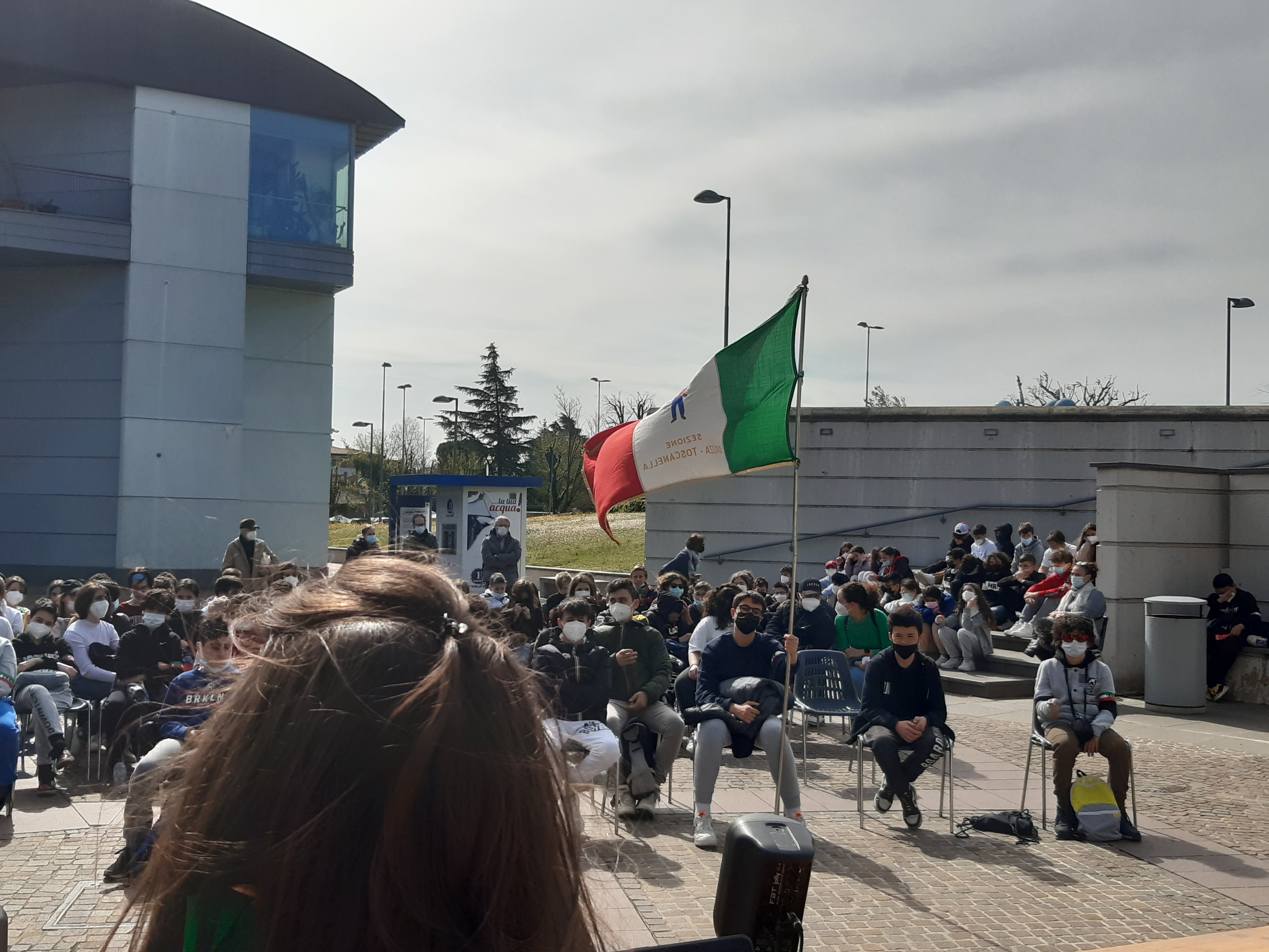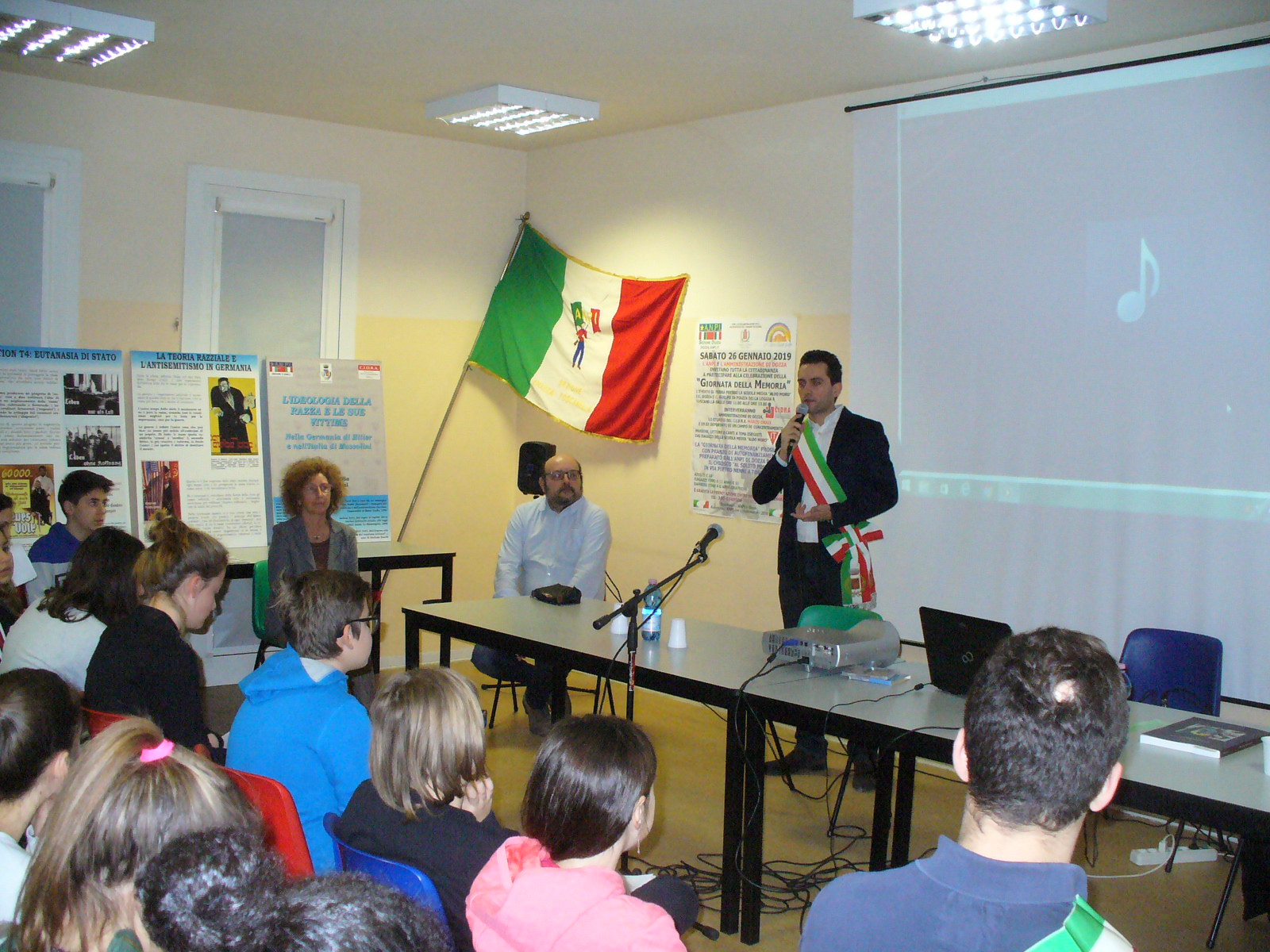 inaugurazione della lapide in ricordo di Andrea Gualandi, classi II A,B e C della Scuola Secondaria di I grado “Aldo Moro”- Progetto di arte pubblica per il 70° della Liberazione ideato da Annalisa Cattani, promosso dai dieci Comuni del Distretto culturale imolesi in collaborazione con Anpi, Cidra e Musei civici di Imola.